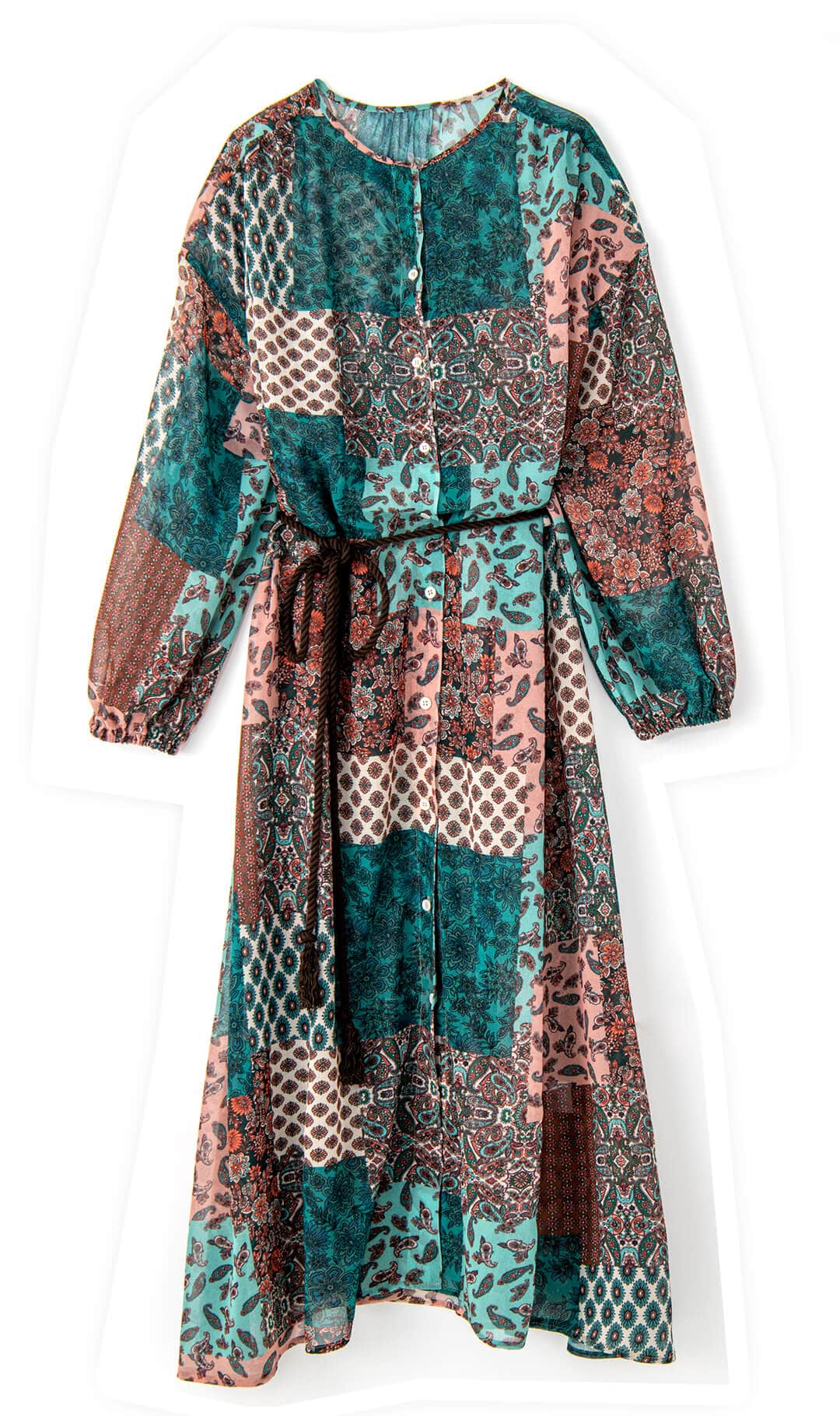 ペイズリーやフラワーの鮮やかなパッチワークが春の気分にぴったりです。ゆったりとした袖口とひざ下の丈感が女性らしさを引き立て、取り外し可能な付属のロープベルトでアレンジも自在。フロントボタンを開ければアウターライクにも楽しめる、使いやすい1枚です。インナーペチコート付き。