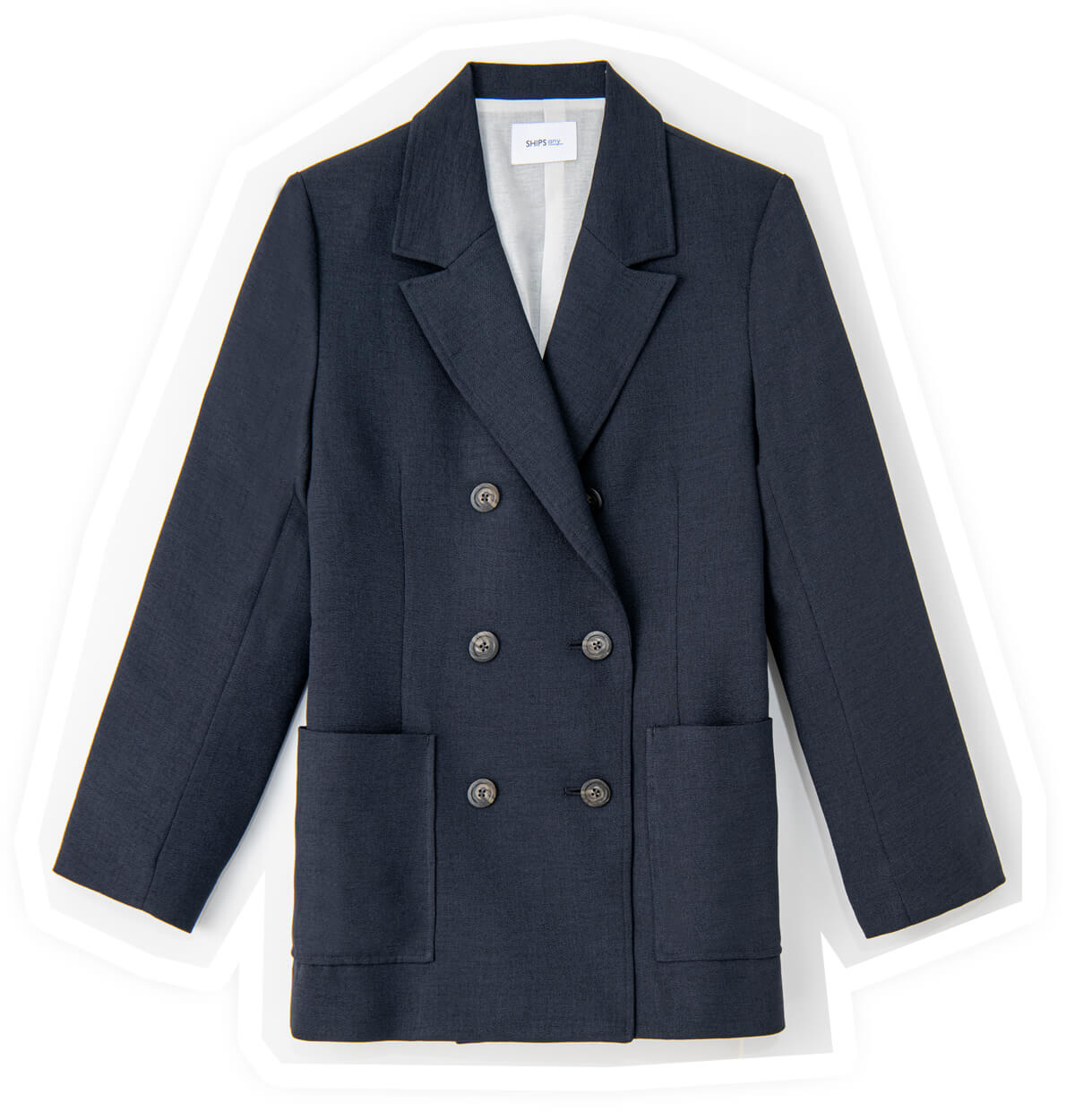 生地にはシワになりにくいスラブ糸を使用し、着心地も快適。肩まわりに適度な薄さのパッドが内蔵されていて、着用時に美しい立体感が生まれるのも魅力です。軽やかな風合いはこれからの季節に重宝すること間違いなし。凛としたネイビーでキレのあるお仕事スタイルに。