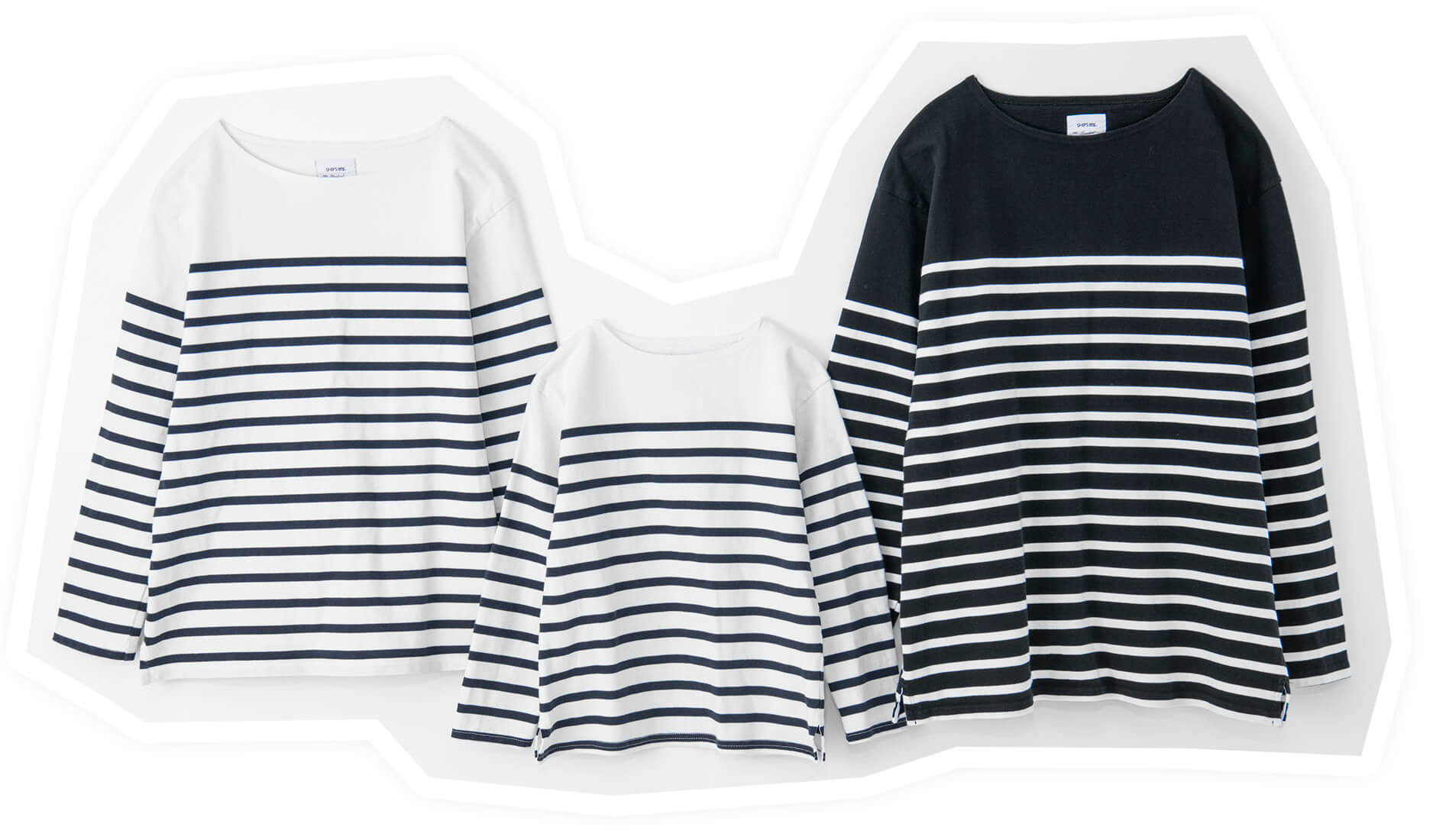 親子リンクや夫婦シェアができるだけでなく、サイズ選びをボーダーレスに楽しめるのも魅力のシリーズの、オリジナルボーダートップス。
