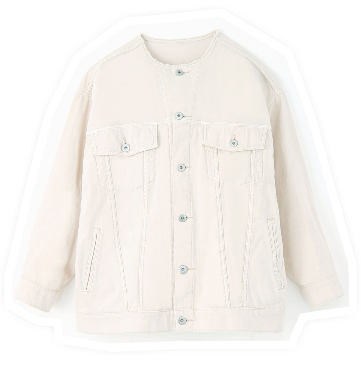 製品染めを施したオフホワイトの風合いと、ネックラインのほつれ加工が旬のヴィンテージ感を醸すノーカラーGジャン。
