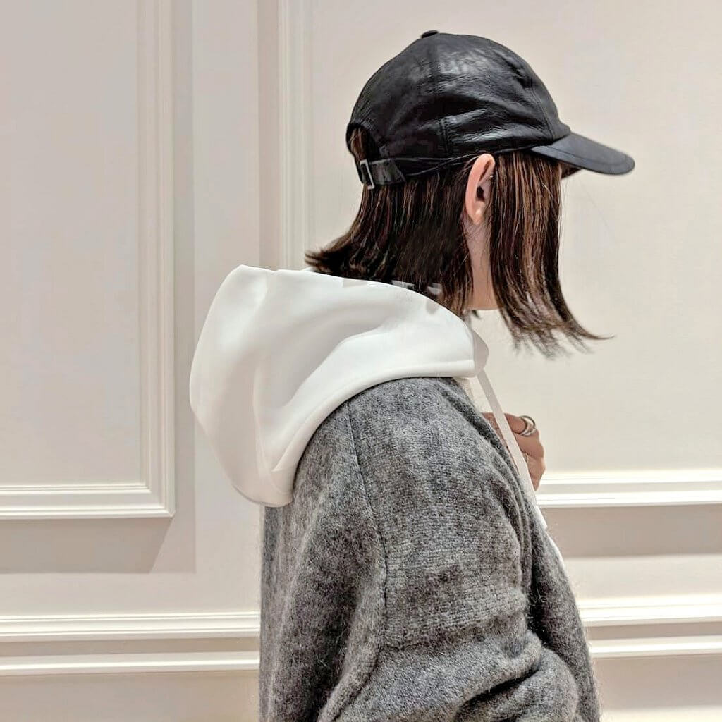 【4・No.003 エミッコさん】「ロング丈のカーデやコートにIN→フード出しで楽しみたい私としては、この大きめフードのボリュームがもう最高♡ハリはあるのに触るととってもソフトな素材ゆえ、カーデの袖先からちょこっと袖を出したり、何ならハイウエストボトムに裾をINしたりしてもモタつかず。ストレスフリー」