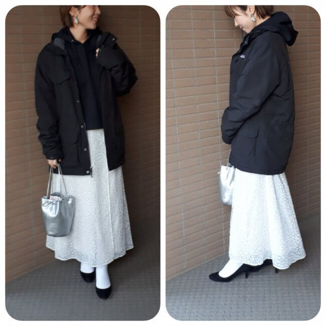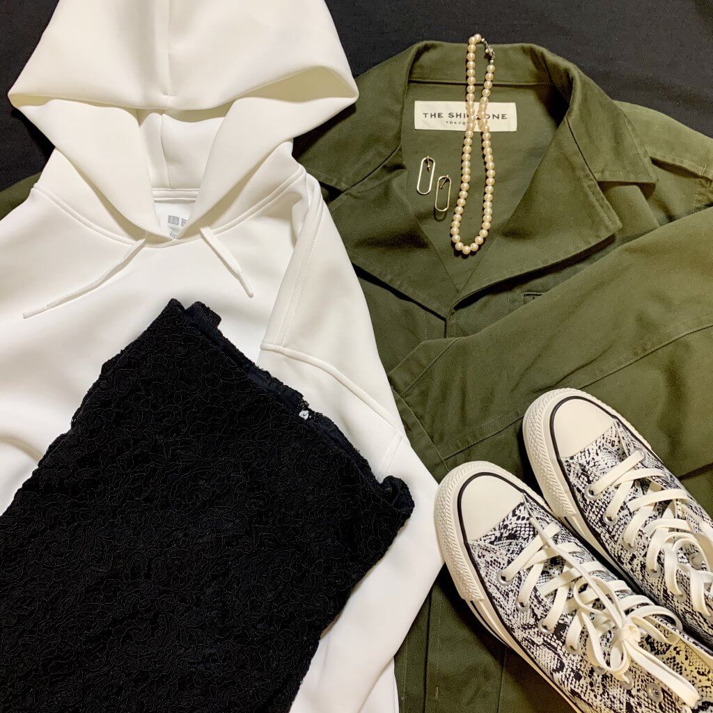 【3・No.093 kyonさん】「購入することはすぐ決めたのに、色問題!!ベージュもグレーも柔らかい色味で、春色のグリーンやピンクとの相性抜群。えー、どれにしよ。3色もって試着室で20分。悩みすぎて少し気持ち悪くなりかけた私(笑)。試着室出てからも店頭の春色スカートと合わせまくって変な人でした……。結局悩みに悩んであまり持っていない白にしましたが、ベージュもグレーもどストライクの色♡早速置きコーデしてみました。ミリタリー×黒レース×スネーク柄で大人カジュアルに。ジャケットにも合うフードの大きさ!←フードの立ち上がり強調しすぎでごめんなさい(笑)。パールでバランスを」