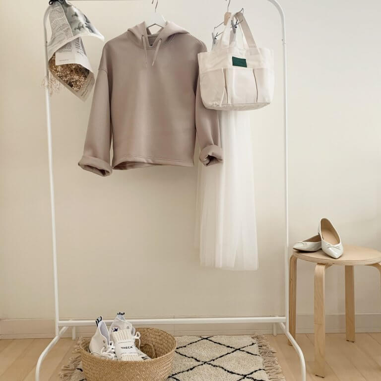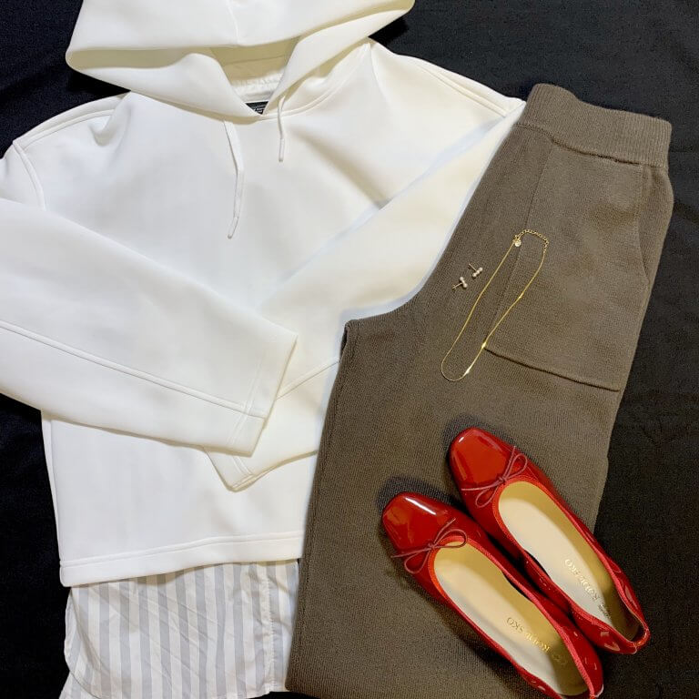 【8・No.030 aiさん】「100人隊の皆さんが購入しているUNIQLOのドライソフトスウェットプルパーカが気になっていて限定価格の時に購入しました。とても気に入って沢山着ています。ホワイトとベージュのLサイズ(身長170㎝)。丈が短めなのでスカートと合わせるにはMサイズでも良さそうだけど、パンツとも合わせるならLサイズかなと試着して決めました。お気に入りのところは、洗濯してもフード部分まですぐ乾く、フードのボリュームが可愛い、抱っこ紐なので赤ちゃんが顔をスリスリしても痛くない、動きやすい」