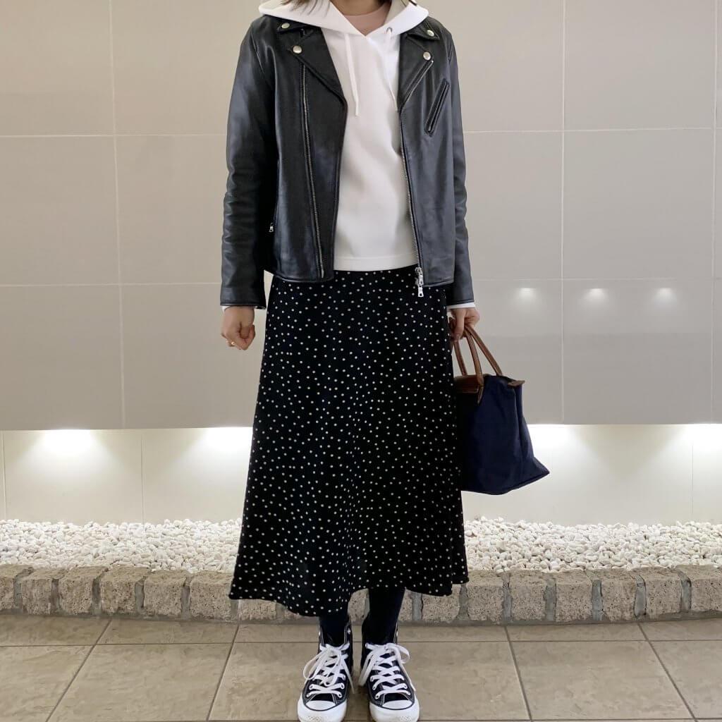 【3・No.093 kyonさん】「ちなみにトップ画像のコーデ。レザー×ドット。差し色にインナーをピンクにしたはずだったのにほぼ見えてなくて全体的に暗めな残念な感じになってしまいました……。カバン違うのにしたらよかったかな」