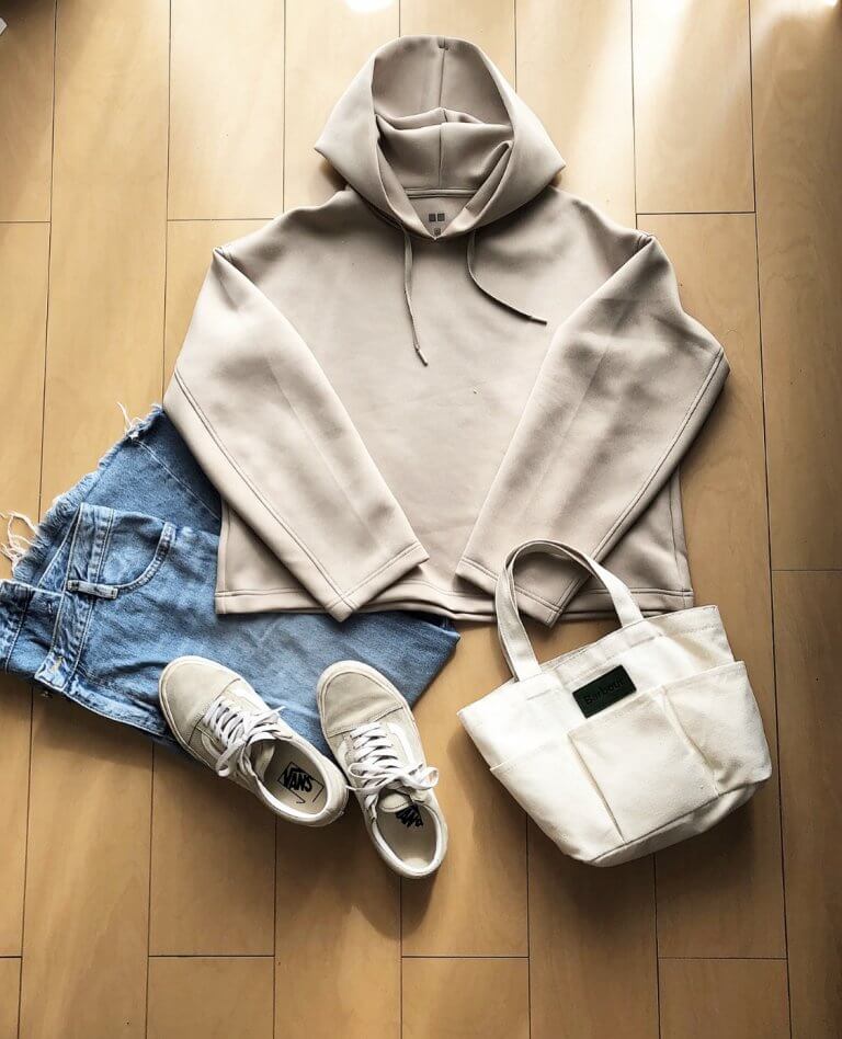 【1・No.081 おさきさん】「ユニクロのドライソフトスウェットプルパーカ。シルエットが可愛いです。こちら1990円+税。ハリがあって上品!フードもキレイに立ちあがる!洗濯してもすぐ乾く!丈は短めです❤︎私はスカートが多いのでSサイズにしましたが、パンツ多めの方は大きめサイズがいいかもです!仕込みタートルをしてもヨシ」