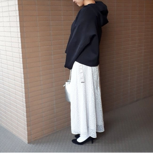 トップスがシンプルなほうがスカートのデザインが映えるので着る時は軽くインして着ています」