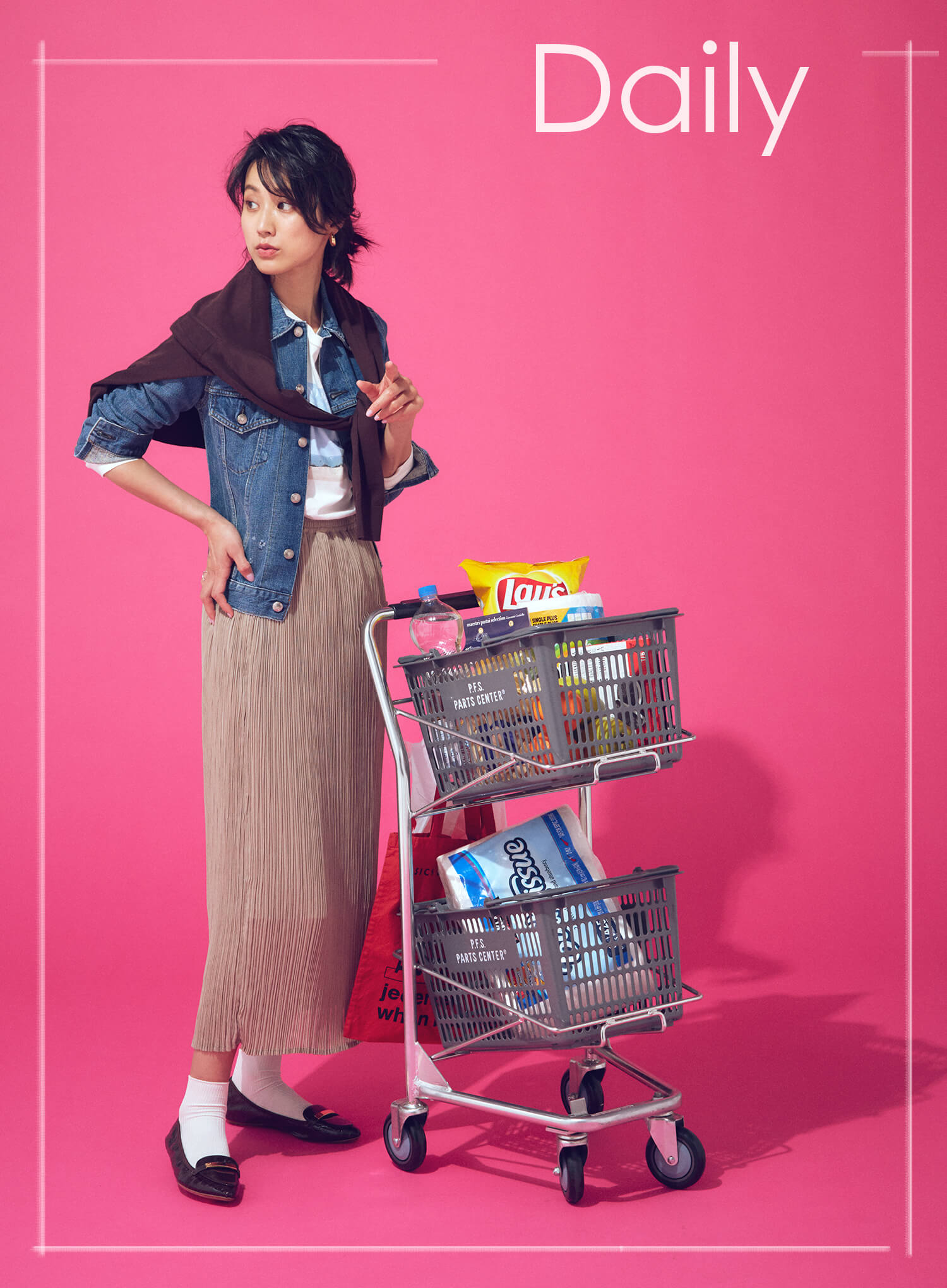 靴¥5900/カメイ・プロアクト(バタフライツイスト) ジャケット¥33000/ボウルズ(ハイク) カットソー¥8000/UTS PR(ハチイチブランカ) ニット¥28000/リーミルズ エージェンシー(ジョン スメドレー) スカート¥8900/ビーミング ライフストア by ビームス アーバンドック ららぽーと豊洲店(ビーミング by ビームス) ピアス¥8200・バッグ¥4500/ライフズ 代官山店(トゥデイフル) リング¥10000/フォーティーン ショールーム(オクト) 靴下¥1000/ブロンドール 新丸の内ビル店(17℃) バスケットつきカート¥29700/ピー・エフ・エス パーツセンター その他/スタイリスト私物