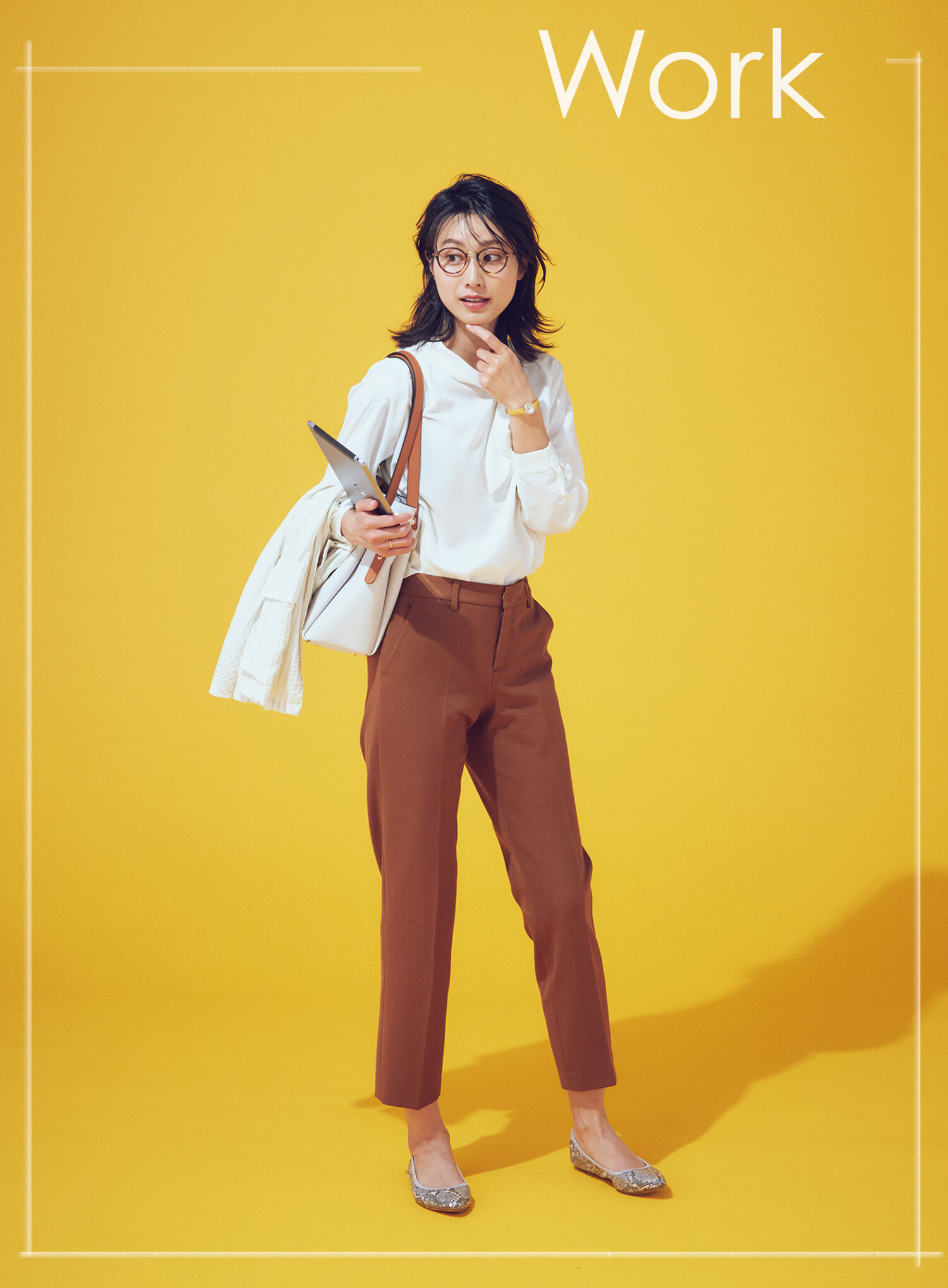 靴¥4900/カメイ・プロアクト(バタフライツイスト) ブラウス¥14000/ミラク(ソーノ) パンツ¥6852/アテニア ブルゾン¥37000/マービン&ソンズ(ワイエムウォルツ) メガネ¥30000/ブリンク ベース(クレイトン フランクリン) リング¥21000/ヴイエー ヴァンドーム青山 有楽町マルイ店(ヴイエー ヴァンドーム青山) 時計¥31500/オ・ビジュー(ロゼモン) バッグ¥6200/ロデスコ アーバンリサーチ ルクア大阪店(ロデスコ)