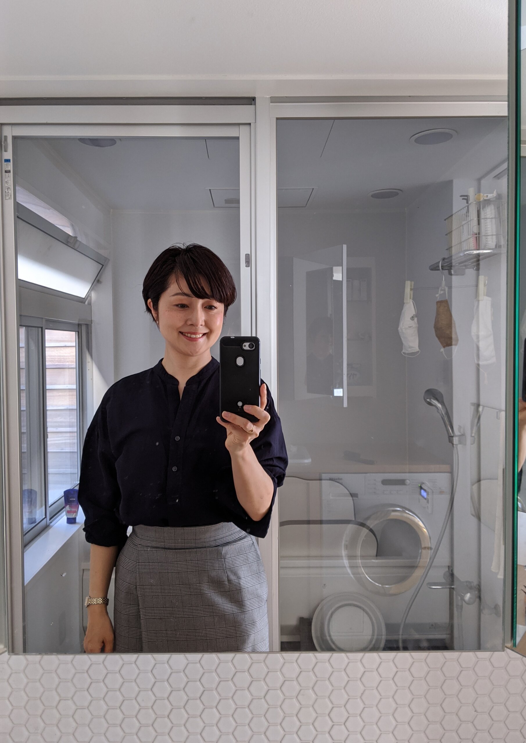 「金曜日。この前買った、リネンブレンドシャツを、UNIQLOの膝下タイトスカートで。暑くなりましたが、七分丈のシャツは、風を通して着心地が良いです」