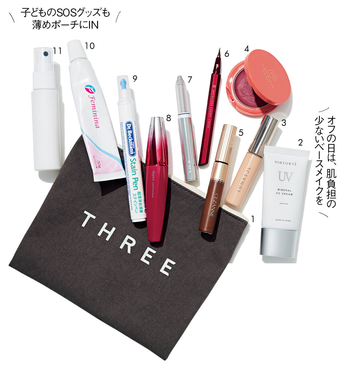 1_MM6のポーチに仕事顔のメイクツールをぎゅっと収納。ベースメイクはカバー力とツヤ感のバランスを重視。