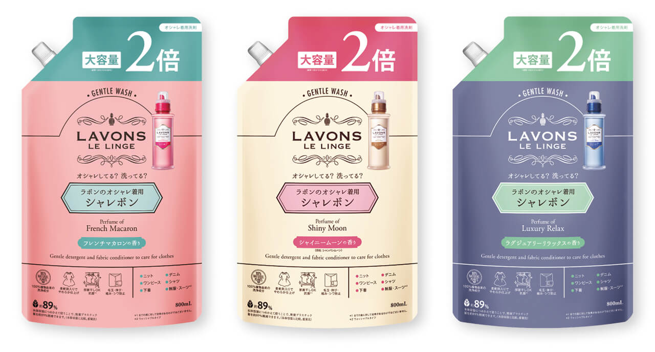 大容量詰め替え用にもフレンチマカロン、シャイニームーン、ラグジュアリーリラックス3つの香りが選べます。詰め替え2倍サイズ(800ml)(各)¥598