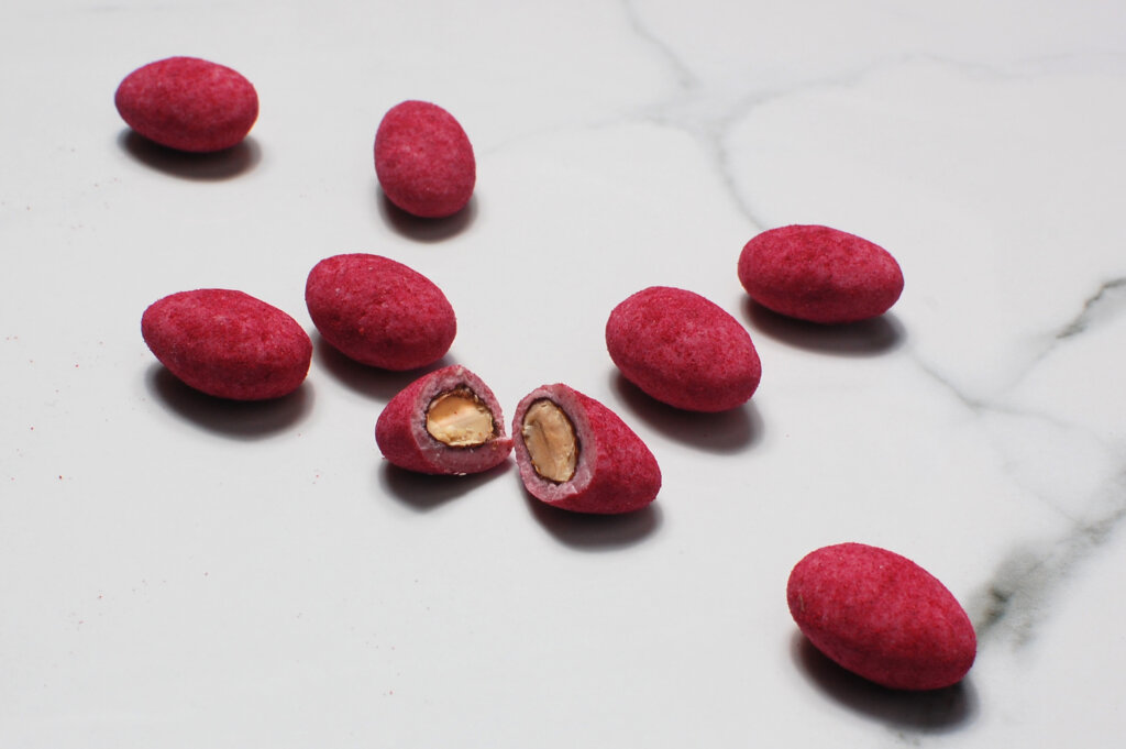 2021年の新商品は、キャラメリゼ ラズベリー チョコレートアーモンド。プレミアム カリフォルニア アーモンドをキャラメリゼしてカリッとさせてから、ビターチョコレートを薄くコーティング。鮮やかなピンクが目を引きますが、まとったラズベリーパウダーは、香料、人口着色料は不使用。甘酸っぱいラズベリーチョコレートを楽しんで。