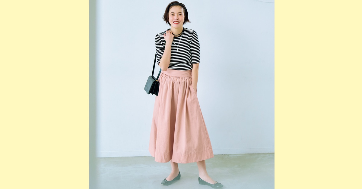 シンプルトップスに合わせるだけでフレンチ気分を楽しめるスカートは、ピンクをチョイスして気分も華やか!/明日なに着る?