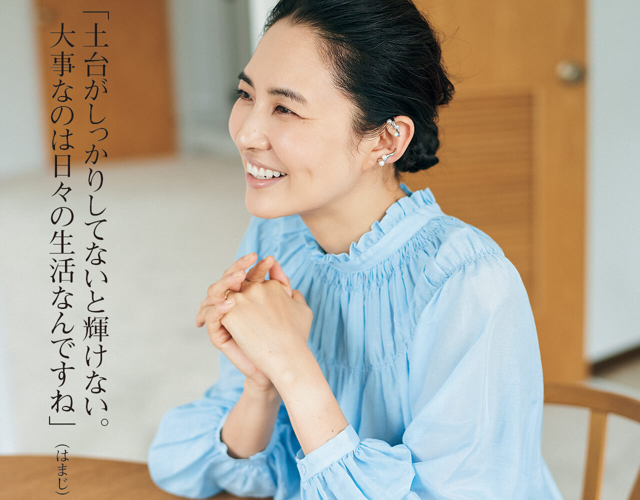浜島直子さん 「土台がしっかりしてないと輝けない。 大事なのは日々の生活なんですね」 (はまじ) (浜島さん)ブラウス¥36300・パンツ¥39600/マックスアンドコー ジャパン カドルカフス¥22000/ジュエッテ