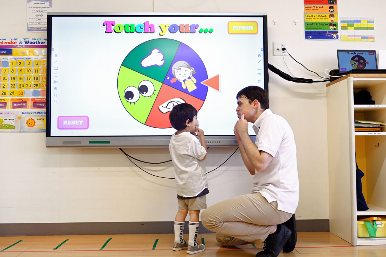 各教室に配備された電子黒板も活用しながら、ネイティブの先生が英語で教えてくれます。今回のテーマ「体」の部位。英語でのコミュニケーションは初体験のりんくんでしたが、先生の動きや表情を見て、やがて「Cheeks!」「Nose!」と声を発するように! 子どもたちは電子黒板にも興味津々だそうで、触ったり、自分で書き込んだりしたい気持ちが、積極的に手を挙げて答えるきっかけにも。まさに日常的に、楽しみながら英語を習得していきます。