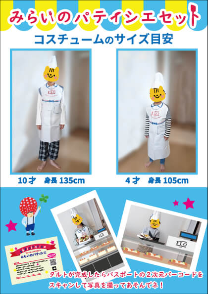 さらにパティシエ気分を盛り上げる、オリジナルデザインの紙エプロン、コック帽、ネームプレート、みらいのパティシエパスポート付き。