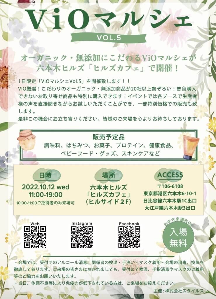 来週10月12日(水)AM11:00~19:00まで、六本木ヒルズ内にあるヒルズカフェ(ヒルサイド2F)で、オーガニック商品を一同に集めた1日限定の「Vioマルシェ」が開催されます。