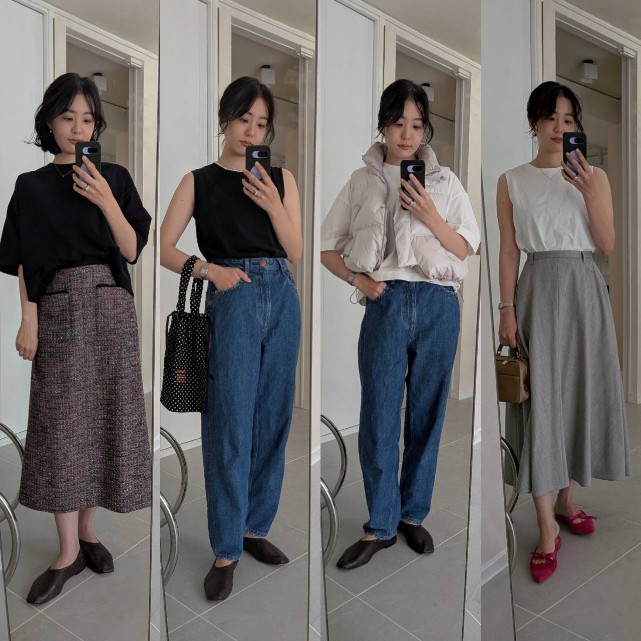 体型カバーにきくAラインシルエットが秀逸。カジュアルに着たい日はインに白Tを、ジャケット+ヒール靴でぐっときれいめに着こなすのもおすすめ。