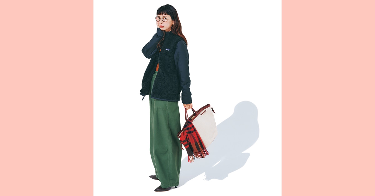 車で大型スーパーへ行くときは本格的なアウターは不要なので、"ワンピonワンピ"のレイヤードにトライ。かぶってはおるだけで簡単に今っぽく仕上がるのがうれしい。慣れ親しんだ黒×カーキの配色でまとめてニット帽とキャンバストートを合わせたら、気負い感もゼロ!