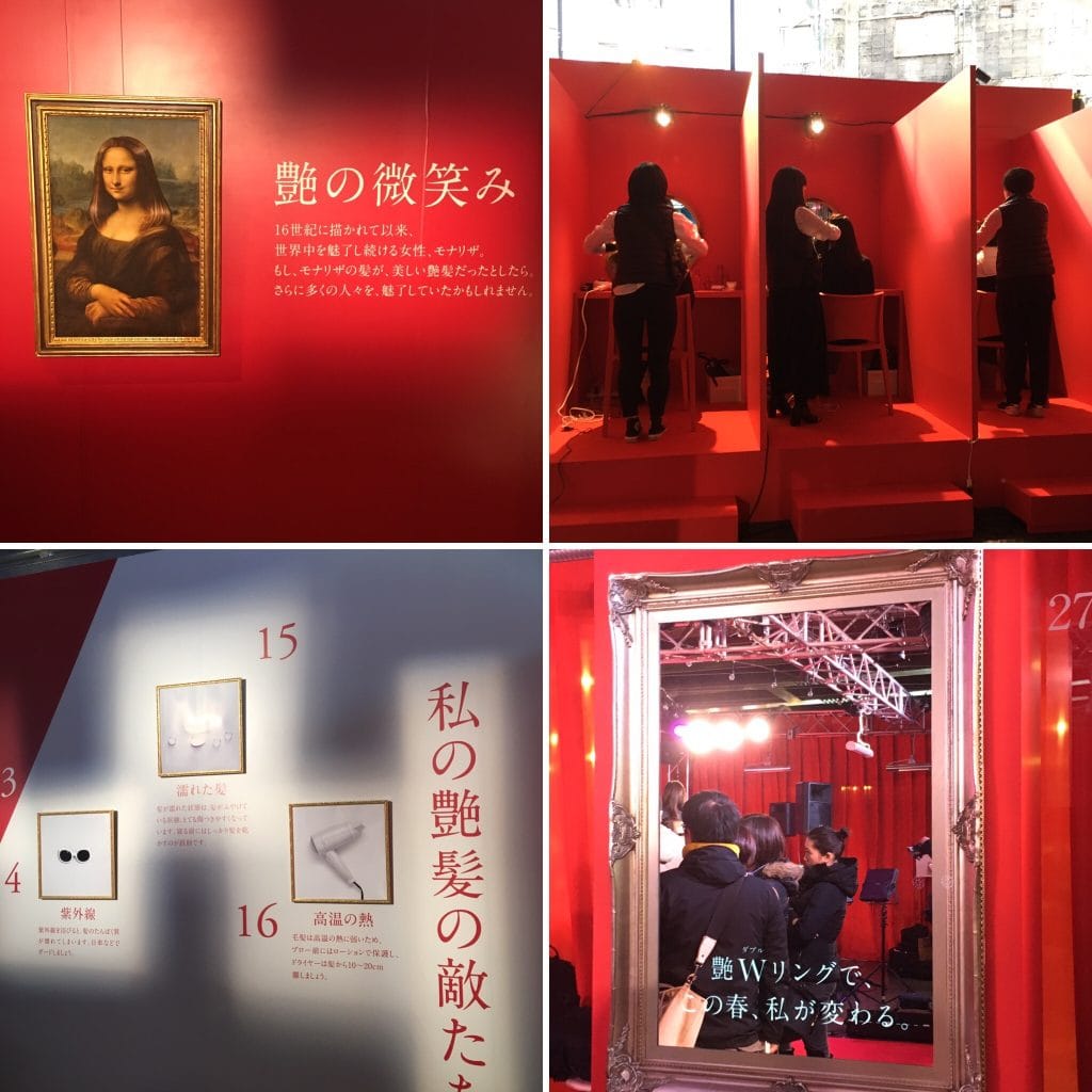 (左上)あのモナリザが艶髪に! 印象がより華やかに。艶って大事なんだなぁ……。 (右上)無料で『TSUBAKI』のアウトバス製品や適切なブローの仕方を体験できるスペース。新宿お出かけの途中にプロの手を借りて艶髪になれちゃいます……!(左下)こんなふうに、艶髪になるためのヒントがあちらこちらに。 (右下)鏡の中の自分の髪に「艶W(ダブル)リング」が見える……という魔法のようなミラー。