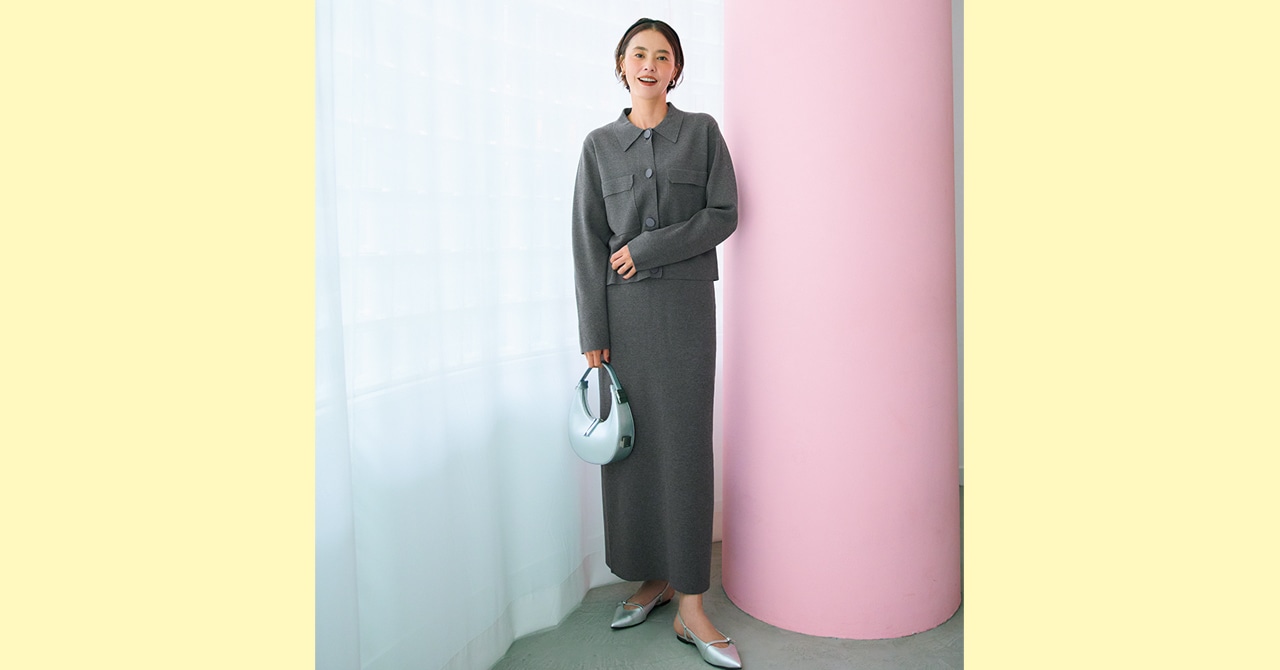 シルバー小物を合わせ洗練のグレー系ワントーンに 12closet 〈トゥエルブクローゼット〉【福田麻琴さんコラボ】ミラノリブニットジャケット¥23100・ミラノリブIラインスカート¥17490