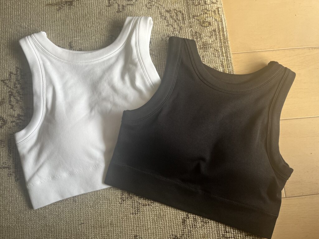 お次は、こちらのカップ付きタンクトップ。実はかなり前から愛用しているんですがヘビロテしすぎて、くたびれた感がプンプン漂ってしまい…思い切って新調することにしました。しかも、このGW期間中はセールで1枚990円に。白と黒を色チ買い。
