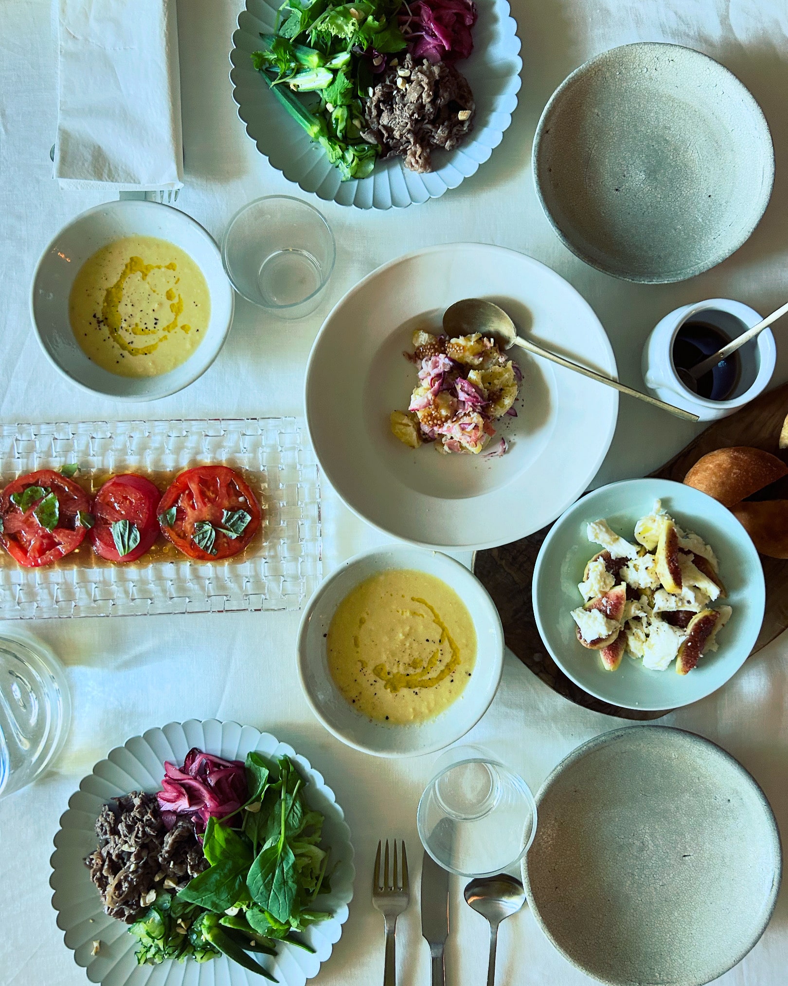 「憧れのTB eringoちゃんのお宅にご招待してもらいました。ランチメニューは、サラダの盛り合わせ、とうもろこしの冷たいポタージュ、塩ゆでしたカリフラワー、牛肉とトマトのラフマジュン風フラットブレッド、パン。スープの器は迷って安藤雅信さんのものを選ばせてもらいました」