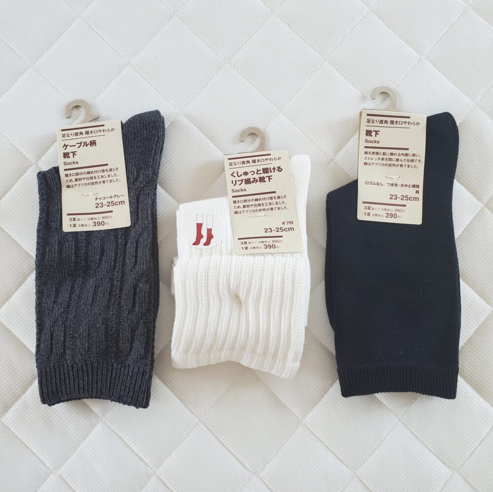 【無印良品 足なり直角靴下】定番、ケーブル柄、くしゅっと履ける3タイプを購入しました