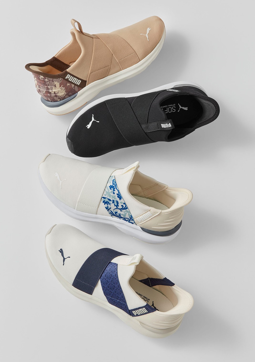 (上から)かかとに柄が入ったデザインには、ノーブルなベージュも。太めのクロスバンドと甲深の相乗効果で足にぴったりフィット。「PROWL 3 EASE IN HGR」¥8690・ヘビロテ確実のオールブラック。程よくボリュームのある白ソールが今どき。「PROWL 3 EASE IN」¥8690・ブルー基調のボタニカル柄をより涼やかに引き立てるエクリュカラーのスニーカー。軽快で、春夏の装いにベストマッチ。「PROWL 3 EASE IN SGR」¥8690・アウトサイドのラバーバンドにだけさりげなく入ったクラシカルな柄が印象的。「PROWL 3 EASE IN W2」¥ 8690/ABCマート(プーマ)