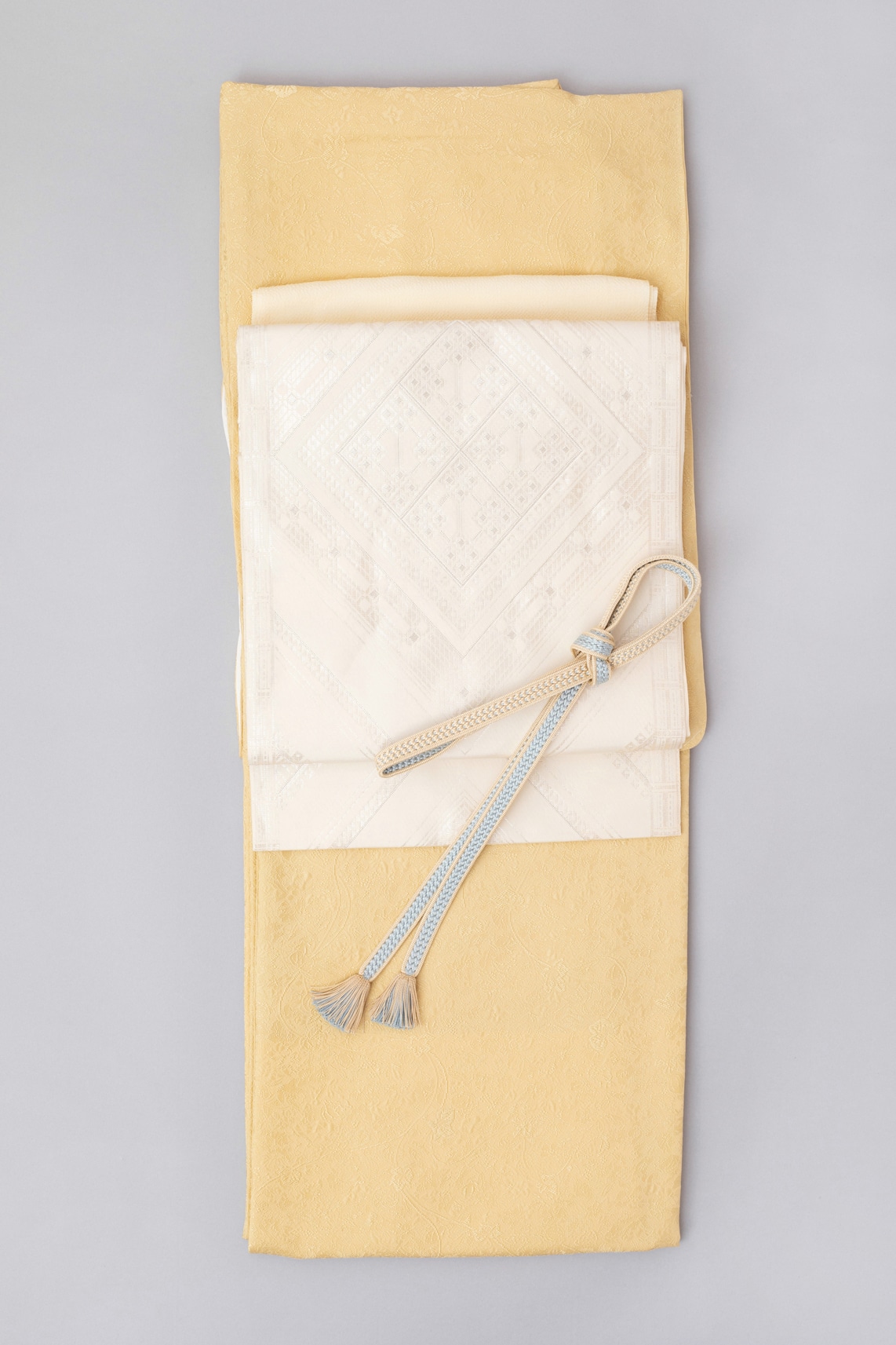 クリームイエローの色無地で、あまり着たことのない色めだったので、この春、購入したものです(半年後、カラー診断で、パーソナルカラーとわかり、驚いたものでした)。