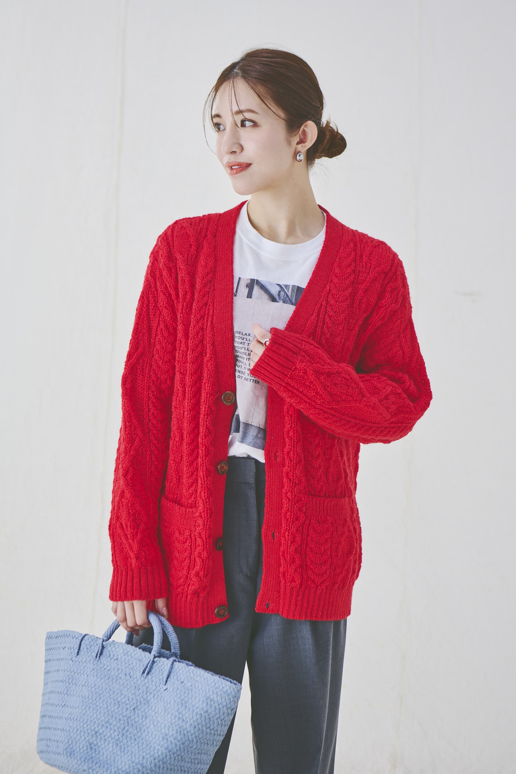 英国の伝統的な技法を取り入れた注目ブランドの定番カーデは、懐かしい風合いのケーブル編みと暖かみのある木のボタンが目を引く一着。オーバーサイズのゆるっとした雰囲気が今どきで、インナーを選ばないのもうれしい限り。昨年に続き、羽織るだけでコーディネートがパッと華やぐ鮮やかなチェリーレッドをセレクト。今年こそ見逃さず手に入れて!