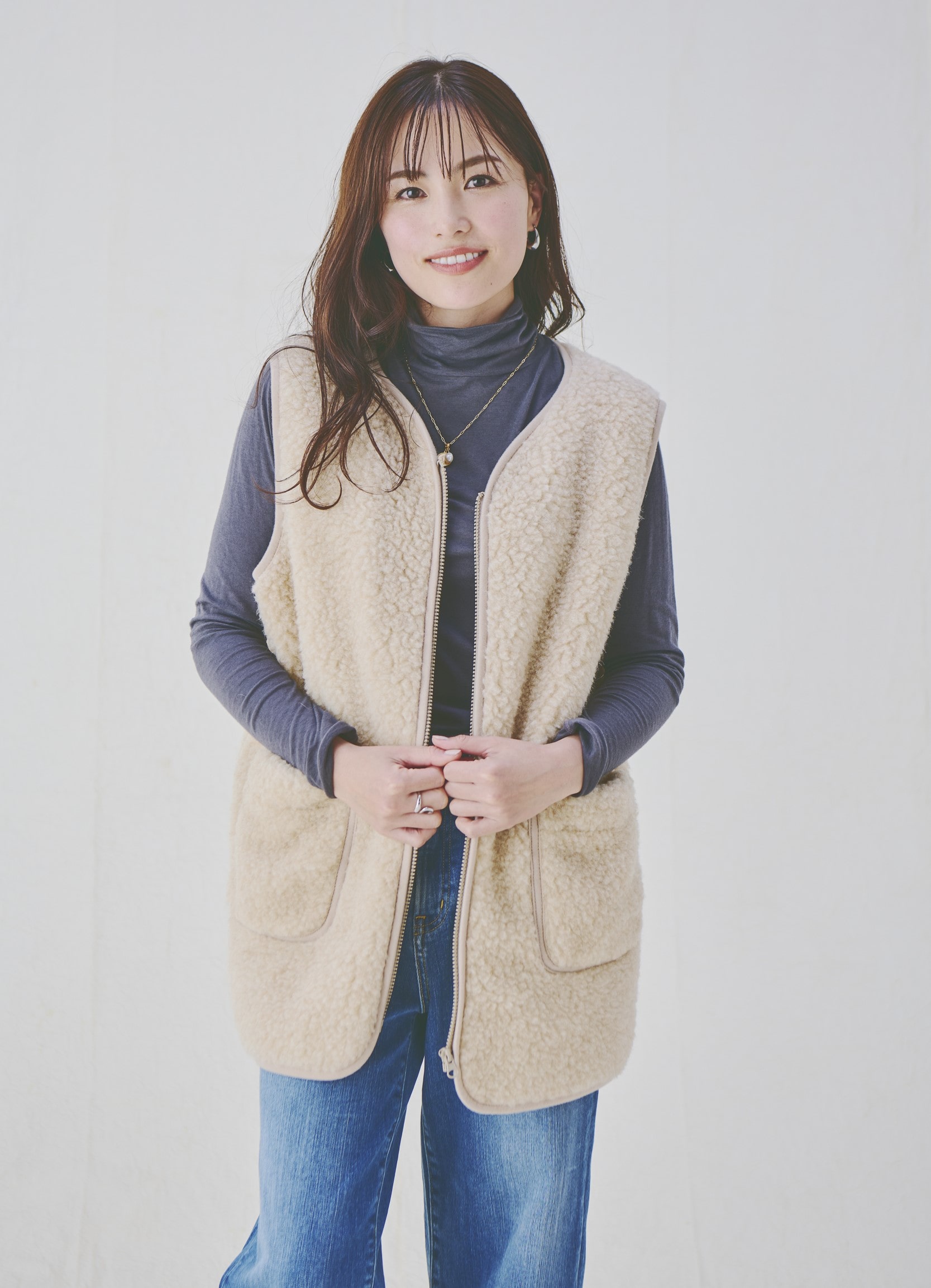 お尻まで暖かいボアベストを重ねて
