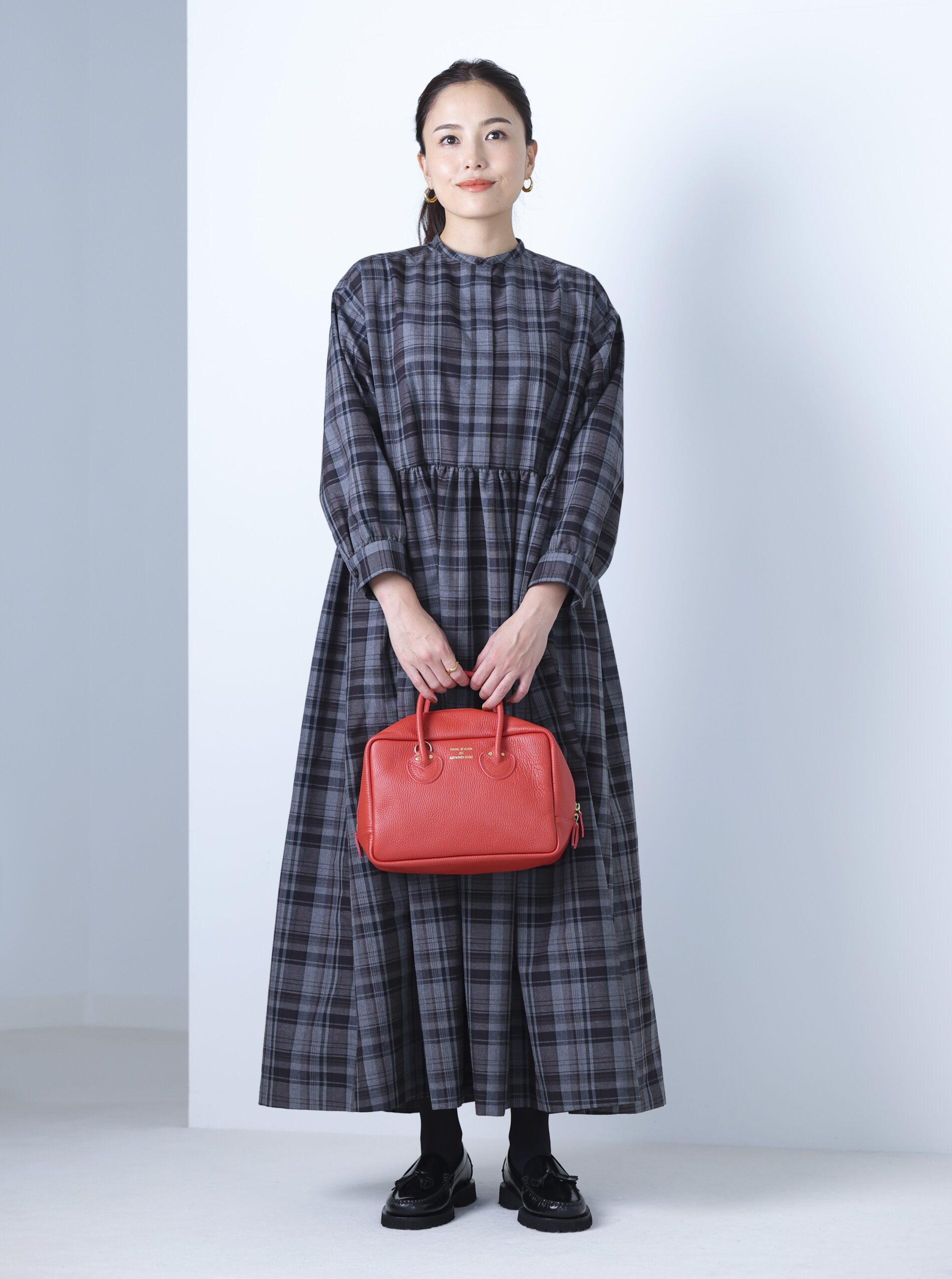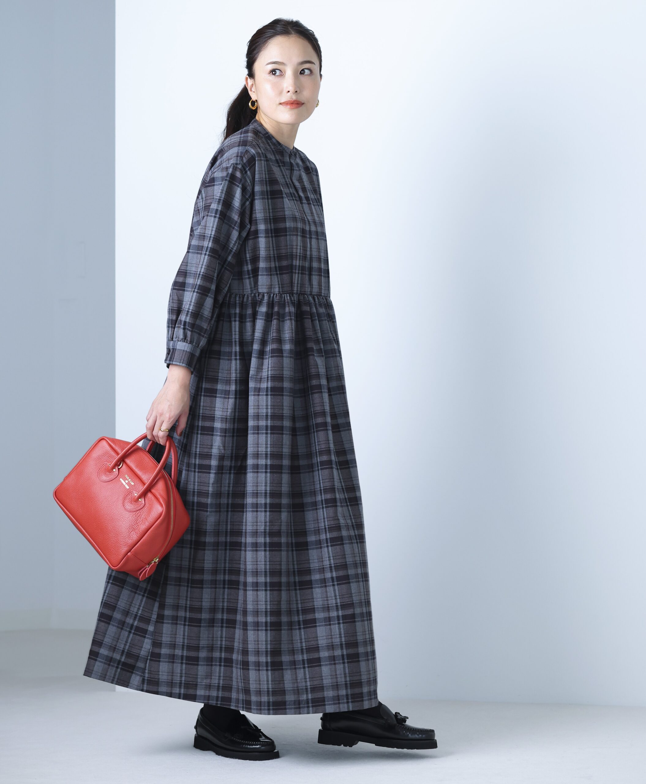 スタイリストの石上さんが、「私のワードローブには柄ワンピースが欠かせません。比翼仕立てのバンドカラーに、ギャザーを寄せたウエスト切り替え、余韻たっぷりな揺れ感。ずっと変わらない大好きな要素を盛り込みつつ、大きめのチェック柄で新しさを出しました」と語るワンピース。生地はポリエステルとレーヨンの混紡素材。春まで着られる素材感&厚みで、シワになりにくさも嬉しいポイント。