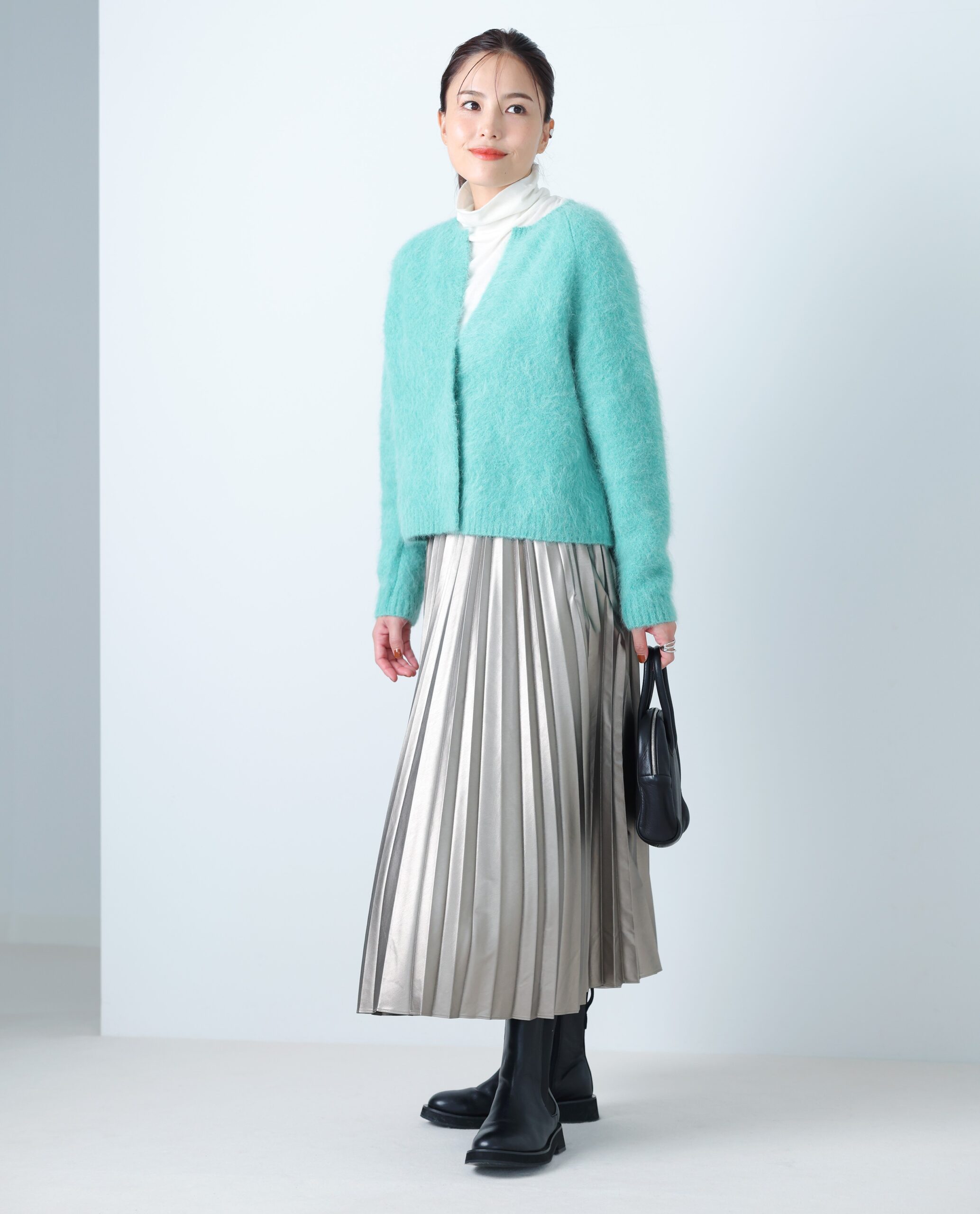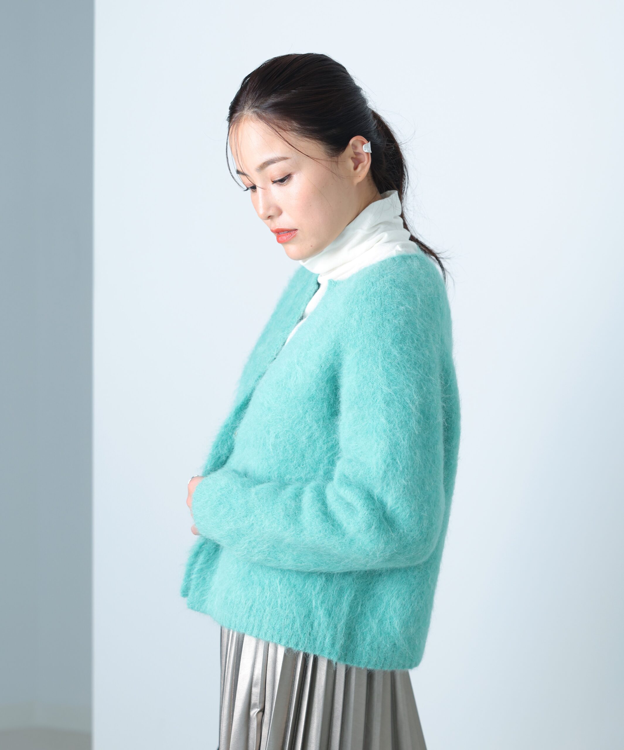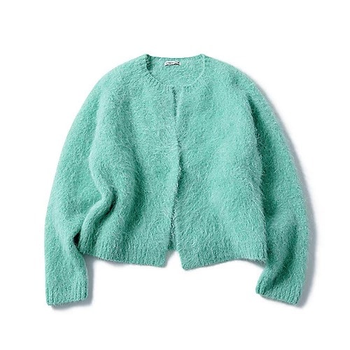 ブランドが毎年人気で展開しているアルパカ混シャギーニット。着るだけで女性らしい甘さを引き立てる、ふんわりとした風合いが魅力です。ボディにほどよいゆとりを持たせたクルーネックタイプで、フロントにスナップボタンが一つ。着丈が短めなので、どんなボトムともバランス良好です。軽量で保温性が高いカーディガンは、冬コーデの活性化に最適。ジャケット感覚で着られそう。