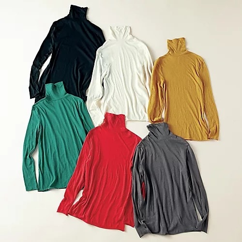 インナーには、12closetの大ヒットを記録したコットンカシミヤタートルをプラス。コットン90%、カシミヤ10%の混紡によるカットソー生地は、柔らかくなめらかで、軽い着心地。タートルネック部分は2 枚重ねになっていて、美しく自然な立ち上がりとたるみを演出。ボディや袖にほんのりと透け感があるので、一枚で着る場合は同系色のキャミソールなどをインするのがおすすめです。