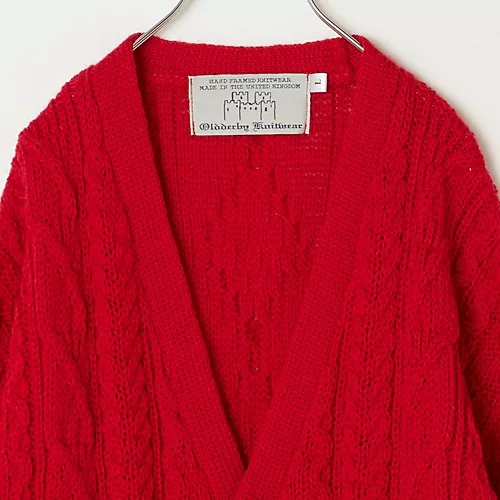 【Oldderby Knitwear (オールドダービー ニットウェア)】Cable Mens Vee Cardigan(ニットカーディガン)鮮やかな赤が可愛い