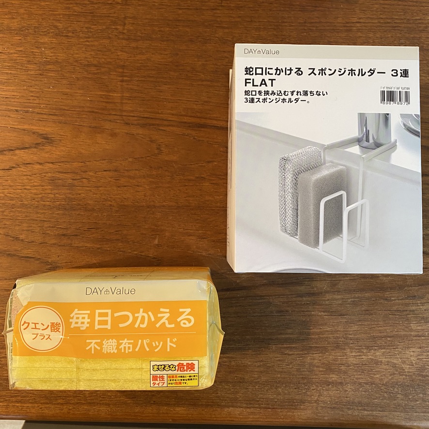 キッチンの当たり前もダウンサイジング。キッチンに備え付けてあるスポンジや洗剤などを置くシンク内のラック。いろいろなものを置けるので便利なのですが、ラック裏が掃除しづらく、水垢が溜まってしまったり、ちょっとしたストレスでした。そこで、ニトリで発見したスポンジホルダーに交換。シンクが広くなって掃除もスイスイとっても快適になりました。