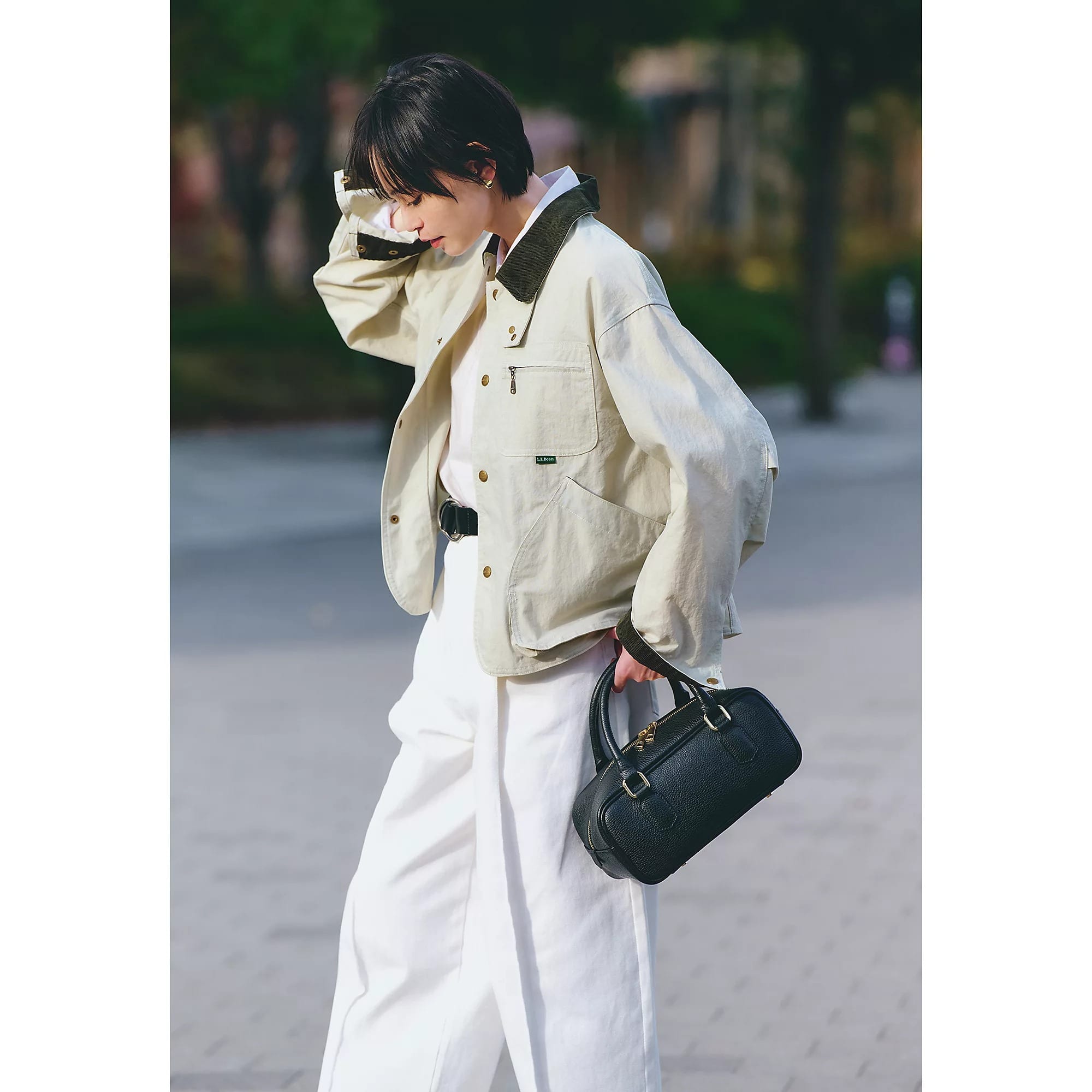 ヒップにかかる丈感ながらとても軽く、たたんで携帯するのにもおすすめです。しかもマシンウォッシャブルだから、外でアクティブに過ごす日も気負わず着用OK。カラーは、着回しやすく洗練されたムードの鉄板ブラックをセレクト。ホワイトのボトムスに合わせれば、シックなモノトーンスタイルに。