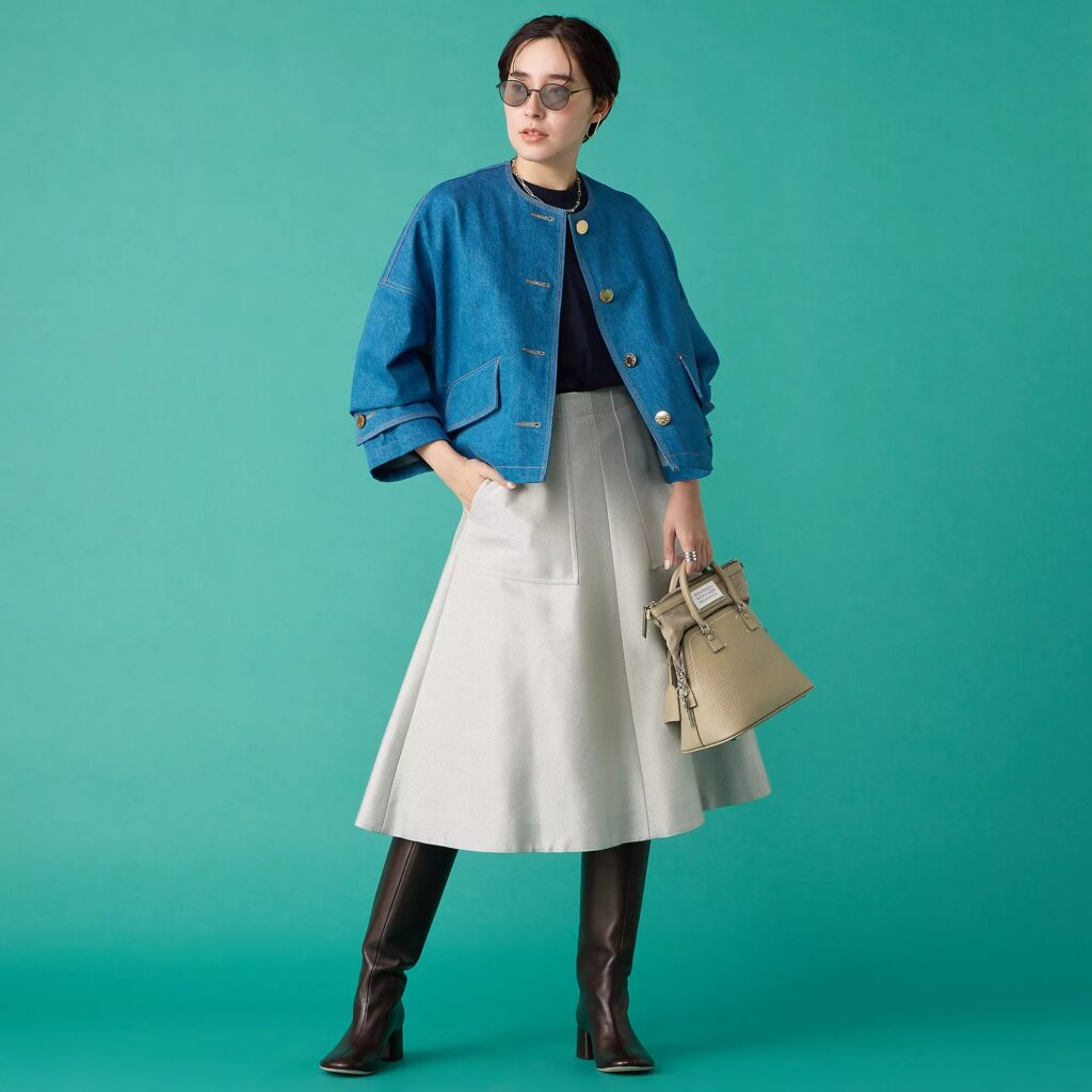 特に今年2025年に流行るワイドパンツやボリュームのあるスカート、春夏に出番が増えるワンピースとは相性抜群です。女性らしいドロップショルダーやゆったりとしたフォルムがさらに魅力的に。このハリとゆとりのあるシルエットは重ね着も得意で、春先は厚手のニットに、暖かくなったらブラウスなどの軽装に羽織っても美シルエットをキープ。だから、季節の変わり目もおしゃれに乗り切れます。