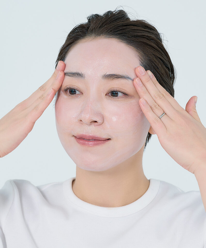 適量を顔全体に、摩擦がかからぬよう軽いタッチでのばし広げる。適量を守ると、最初は白っぽく感じるけれど、なじませるとすぐ透明になるので心配ご無用。むしろ隙なくのばせたことが確認できて◎。