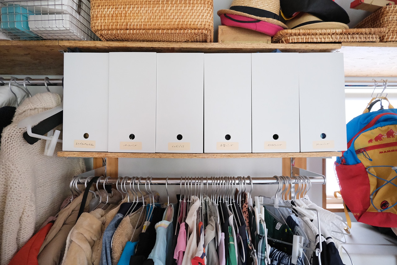 書類の整理だけではなく、我が家では洗面所下デッドスペースで洗剤を収納したり、フライパンを収納したり、上記の写真のようにカバンを収納したりなど、大活躍してくれています。