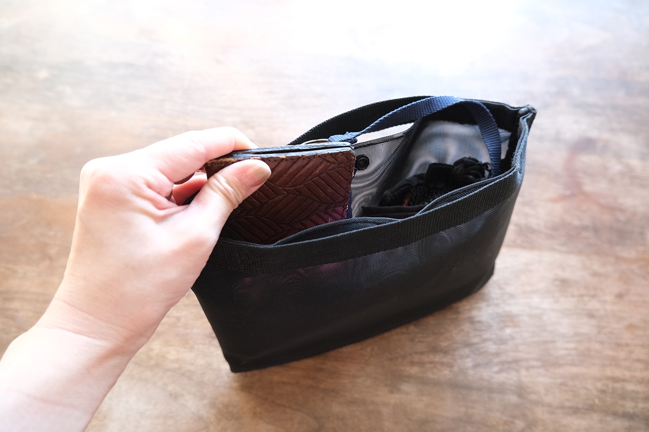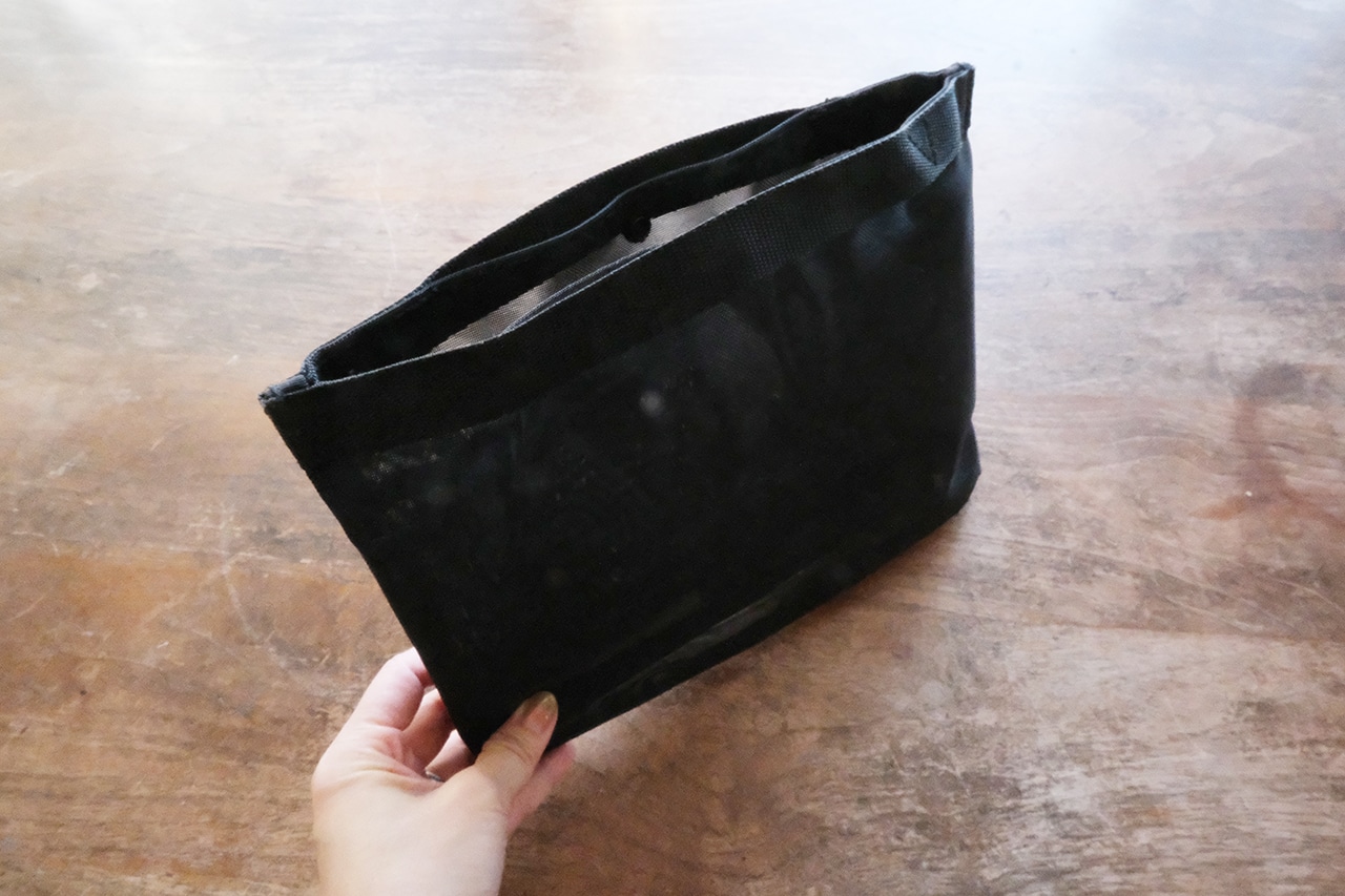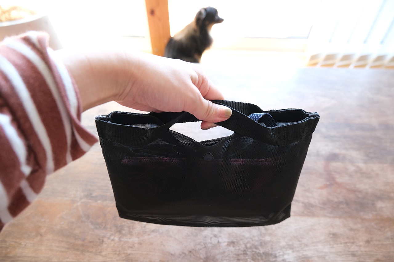 小さい持ち手がついているので、お昼休みに必要なものだけまとめてお出かけするのにも適しています。メッシュ素材なのでぱっと見で中身が入っているかどうかも確認ができ、機能的です。