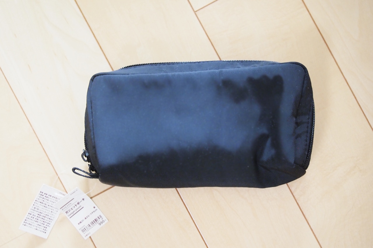 ポリエステルでできたガジェットポーチ。約幅20×高さ9×マチ6cmという大きさで、色は黒とグレーの2色展開です。お値段は990円。