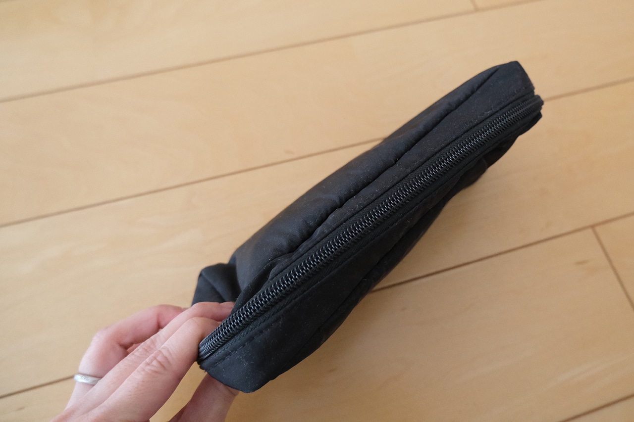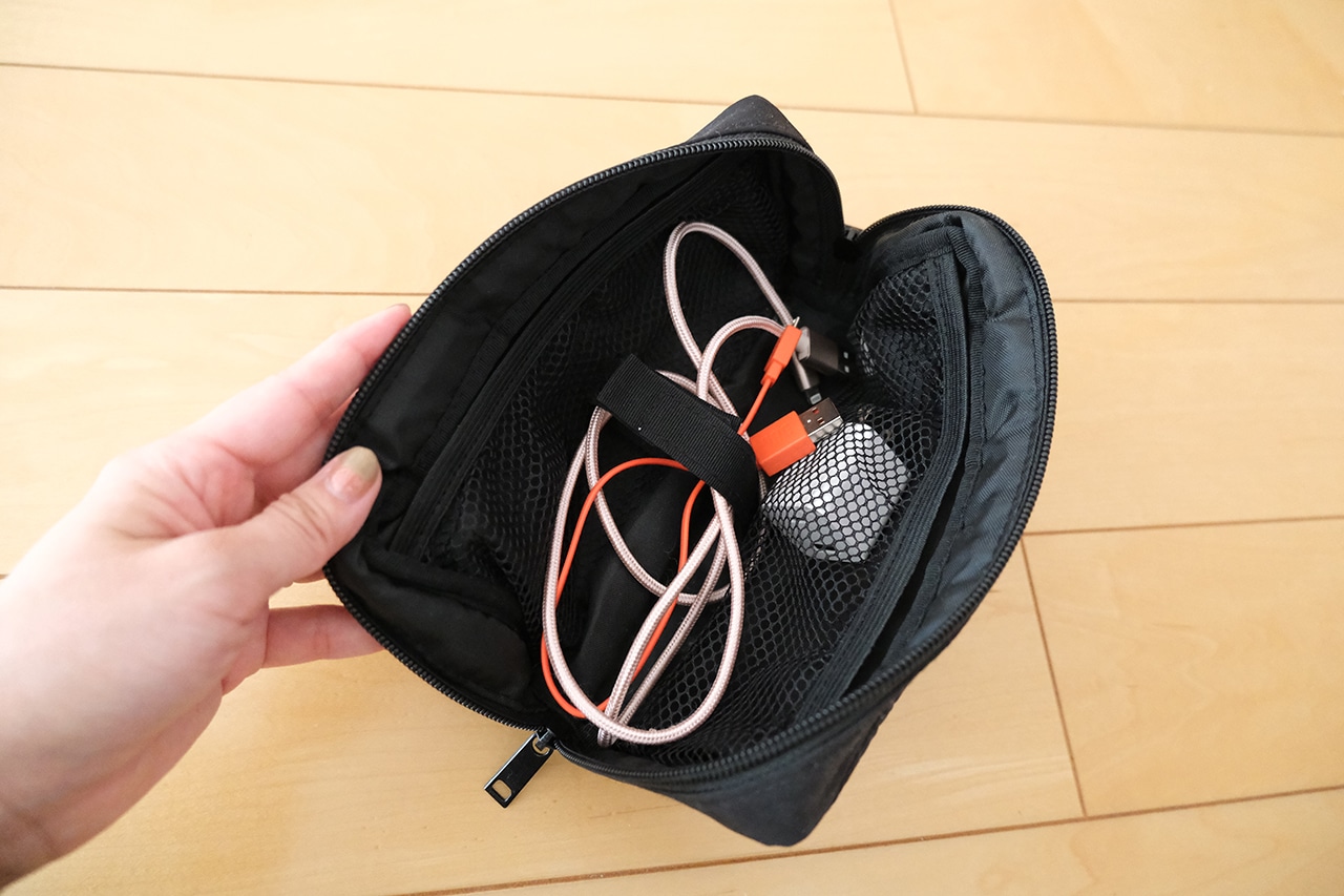 ガジェットケース仕様なので生地は少し厚め。ややデリケートな充電用品を持ち歩くのに適した作りになっています。