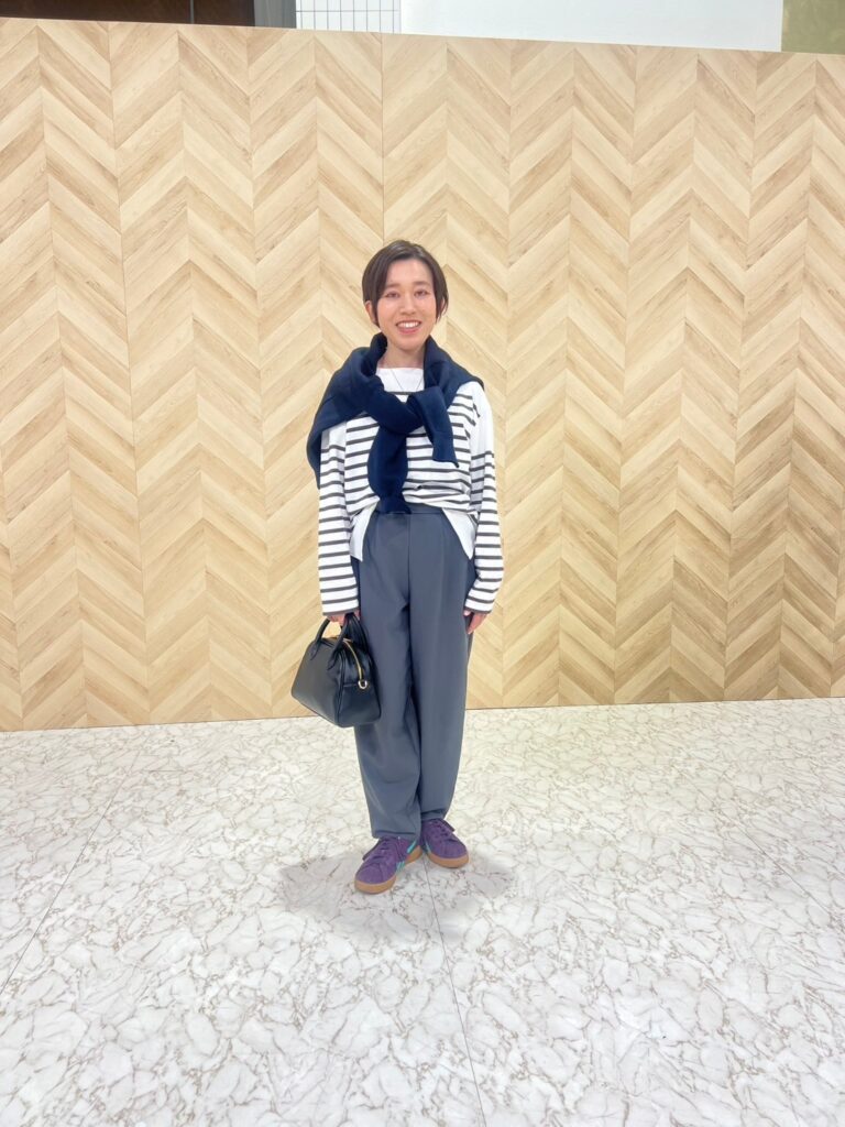 小柄なさとささんは、厚底でボリューム感のあるスニーカーを選びがち。「薄底だと脚が短く見えたりするかなとチャレンジしづらいなと感じていました」というお悩みがありました。高橋さんがオススメしてくれたのは深みのある落ち着いた色合いのスエードのスニーカー。パンツはややワイドなものを選び、足首は隠れる長さ。そしてボーダーシャツのウエストは前部分をインして縦長効果を。ベーシックなコーデのアクセントとなり、大人のスニーカーコーデの完成!