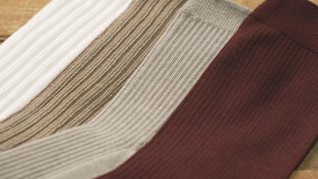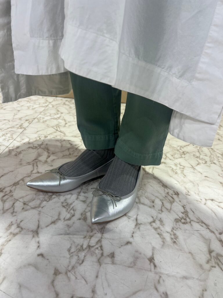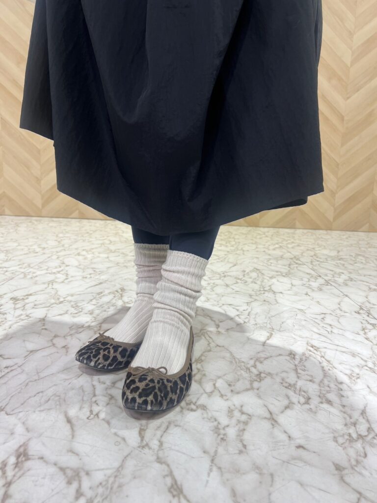 バレエシューズが大好きななおっちさん。色バリエも豊富にたくさん持っていますが、冬はどんなソックスを合わせてよいかわからず靴箱に眠ったままになりがちだと言います。バレエシューズに限らず、この時期のフラットパンプスに合わせやすいのが「万能グレー」のリブソックス。「ボトムと靴のつなぎ役として優秀! ライトグレーからチャコールグレーと色幅が広く、どんなボトムも受けとめてくれます」(高橋さん)