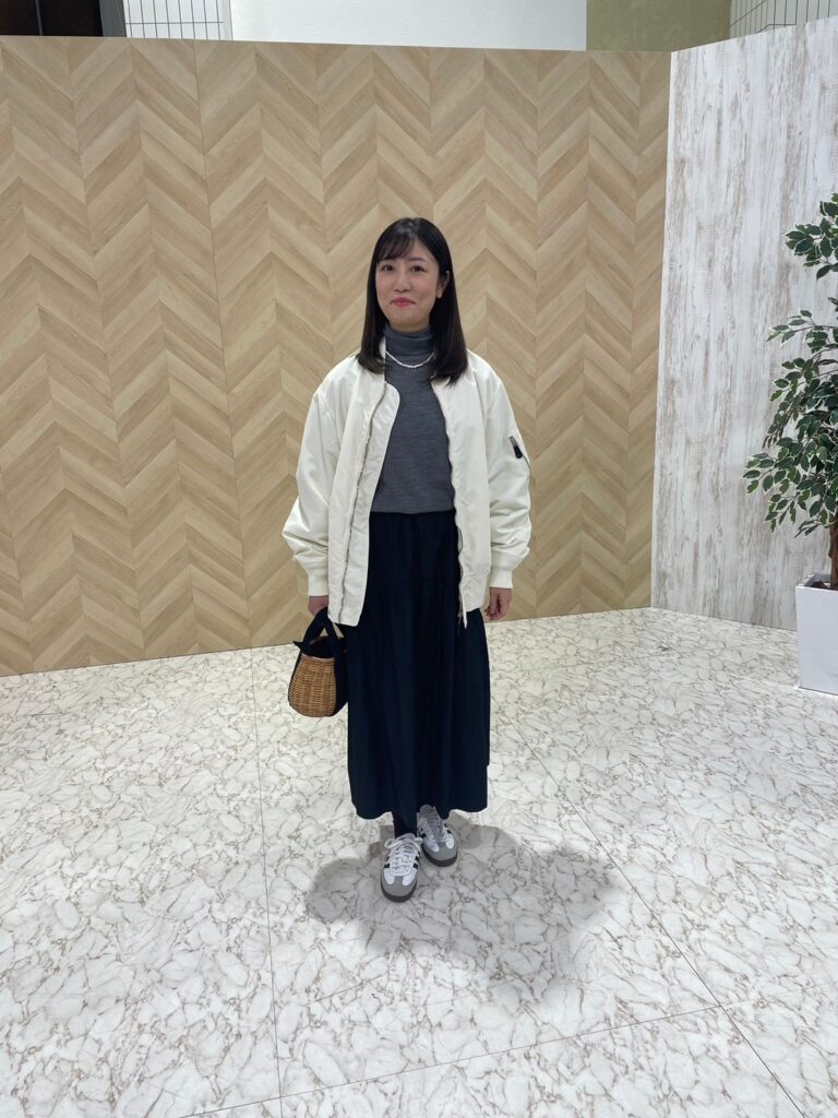 aimiさんの冬のコーデは黒スカート率が高め。「黒タイツに黒フラットシューズというスタイルも多くボトムが黒でまとまってしまい、重く暗い印象を少し変えたいんです」。そこで高橋さんの提案は黒タイツを脱却したレギンス×白リブソックスというスタイル。やや厚手で太目のリブソックスをくしゅっとたゆませて。これなら軽やかさが生まれつつも足元はあったか!