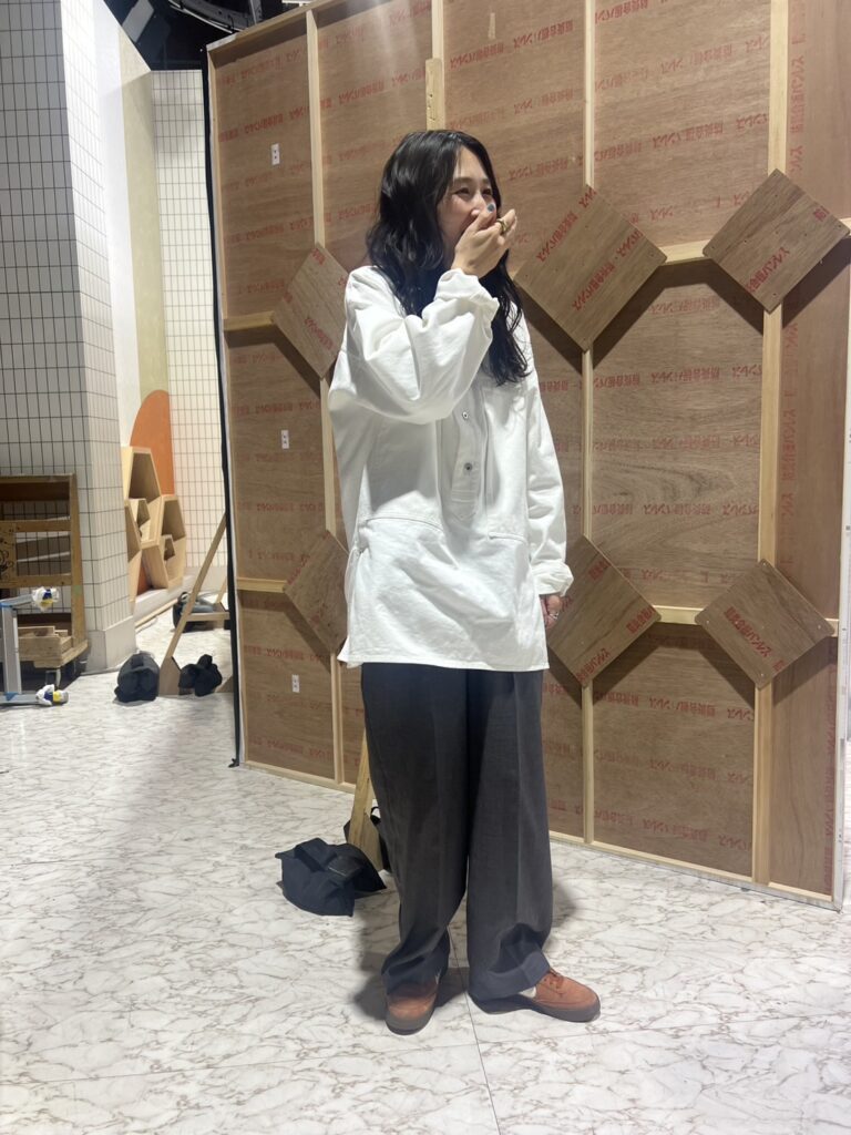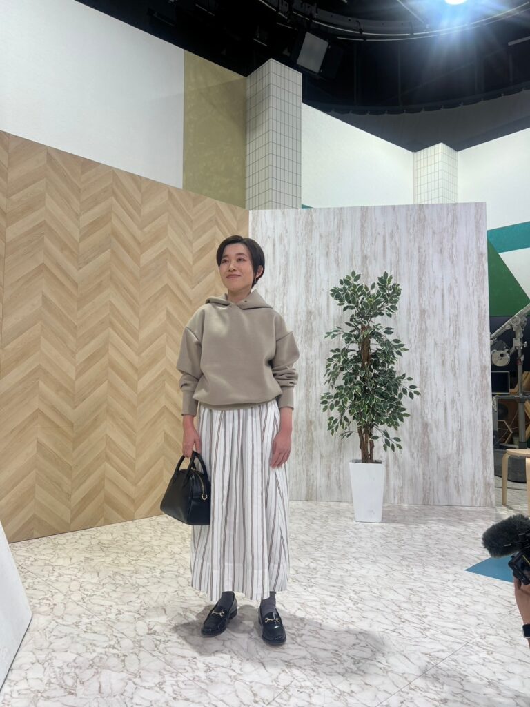 白のシャツにグレーのワイドパンツ、そしてブラウンのスエードスニーカーというスタイルで収録撮影に臨んだ高橋さん。ゆるっとさせたパンツの裾からブラウンのスニーカーがさりげなく見えるバランス感、真似したい! ヘアメイク担当は桑野泰成さん。
