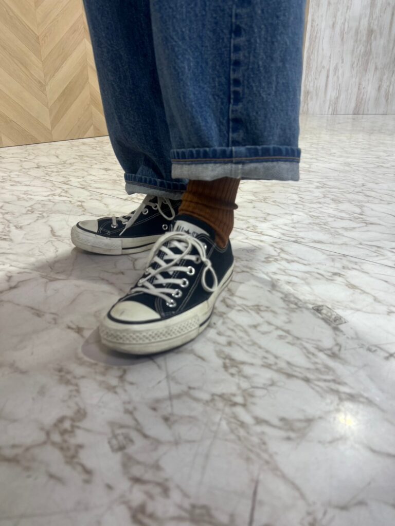 3. 黒コンバースは赤のソックスをちらりと見せるのが気分!