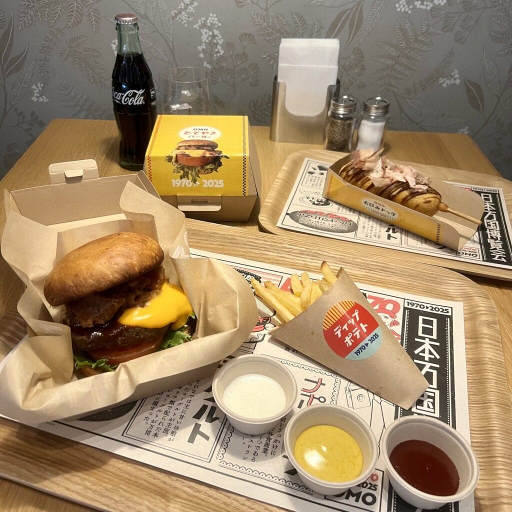 宿泊者だけでなく、日帰り利用者も楽しめるのが、「OMO カフェ&バル」で提供される、期間限定メニュー。大阪で万博が開催されるのは、1970年以来55年ぶり。今回は、1970年の大阪万博で普及した洋食文化に着目。「懐かしいけど、どこか新しい」をテーマに、当時流行したハンバーガーとアメリカンドッグを、なにわグルメと掛け合わせたメニューを開発したのだそう。